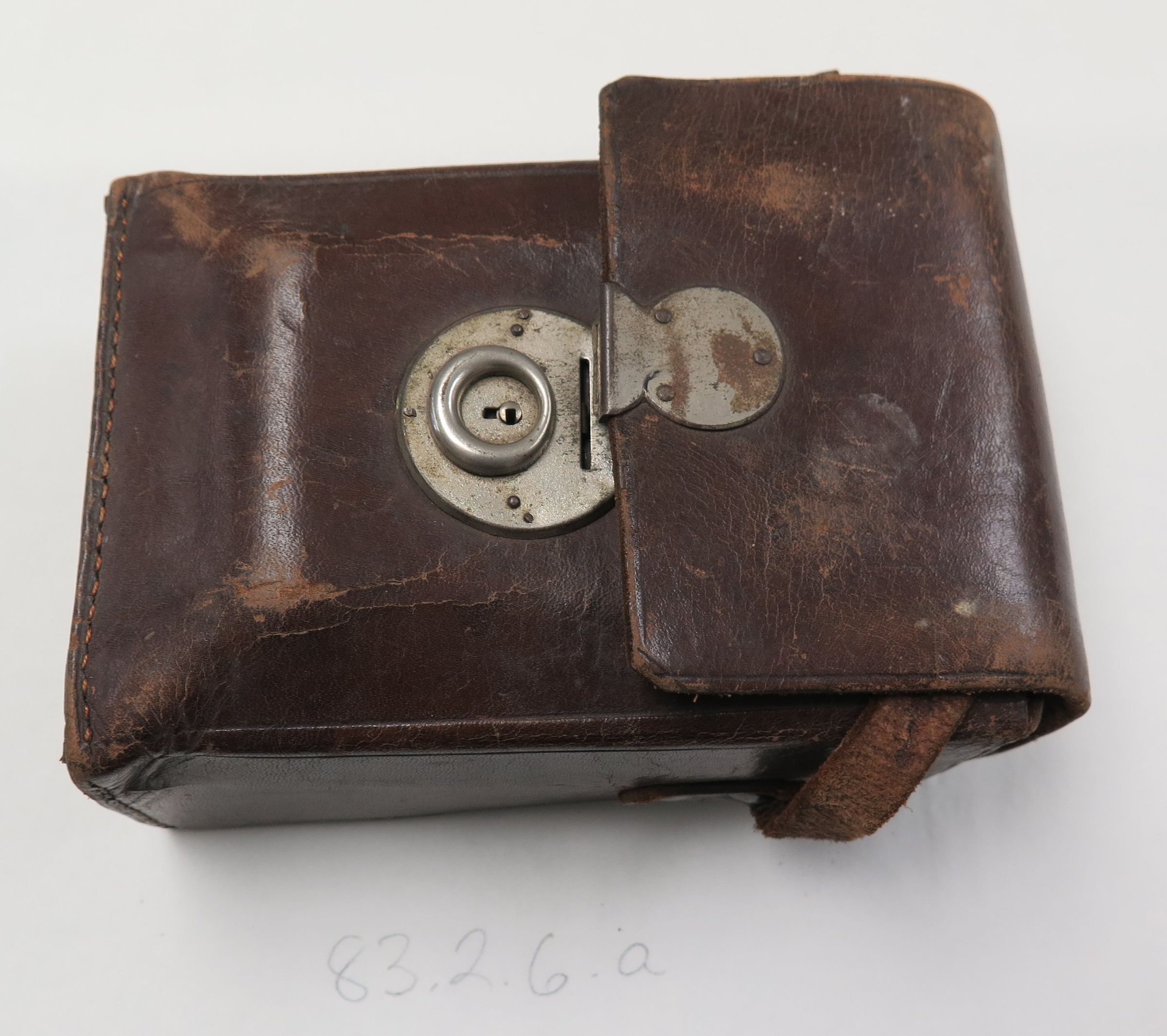 Part a, the camera case has a leather strap and a metal closure. The case measures 7.5" (h) x 4.5" (w) x 2.5" (d).