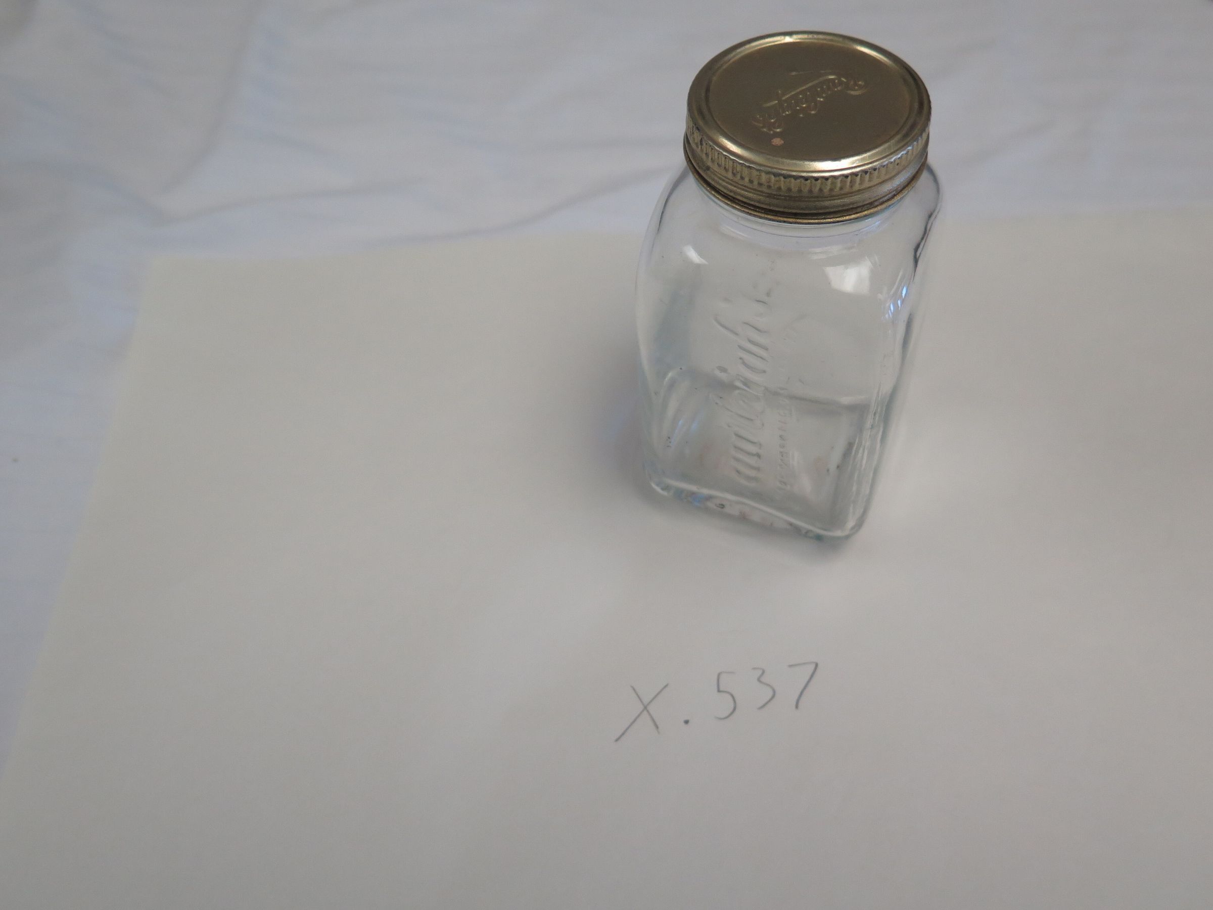 This is a glass jar with metal lid. The jar has a square bottom and a round top. The lid has the word "Rawleighs" on the top. The jar measures 5" (h) x 2.75" (w) x 2.75" (l).Collection