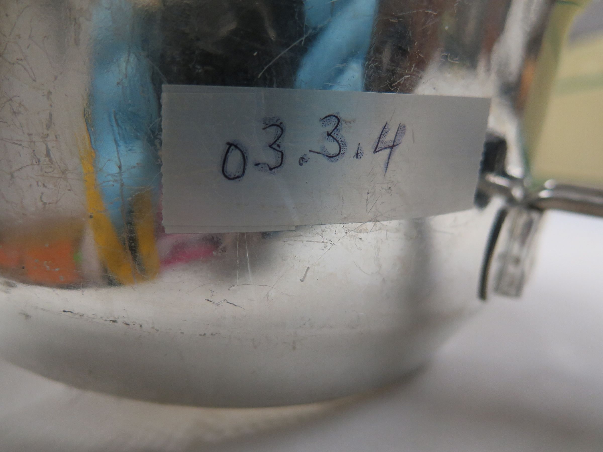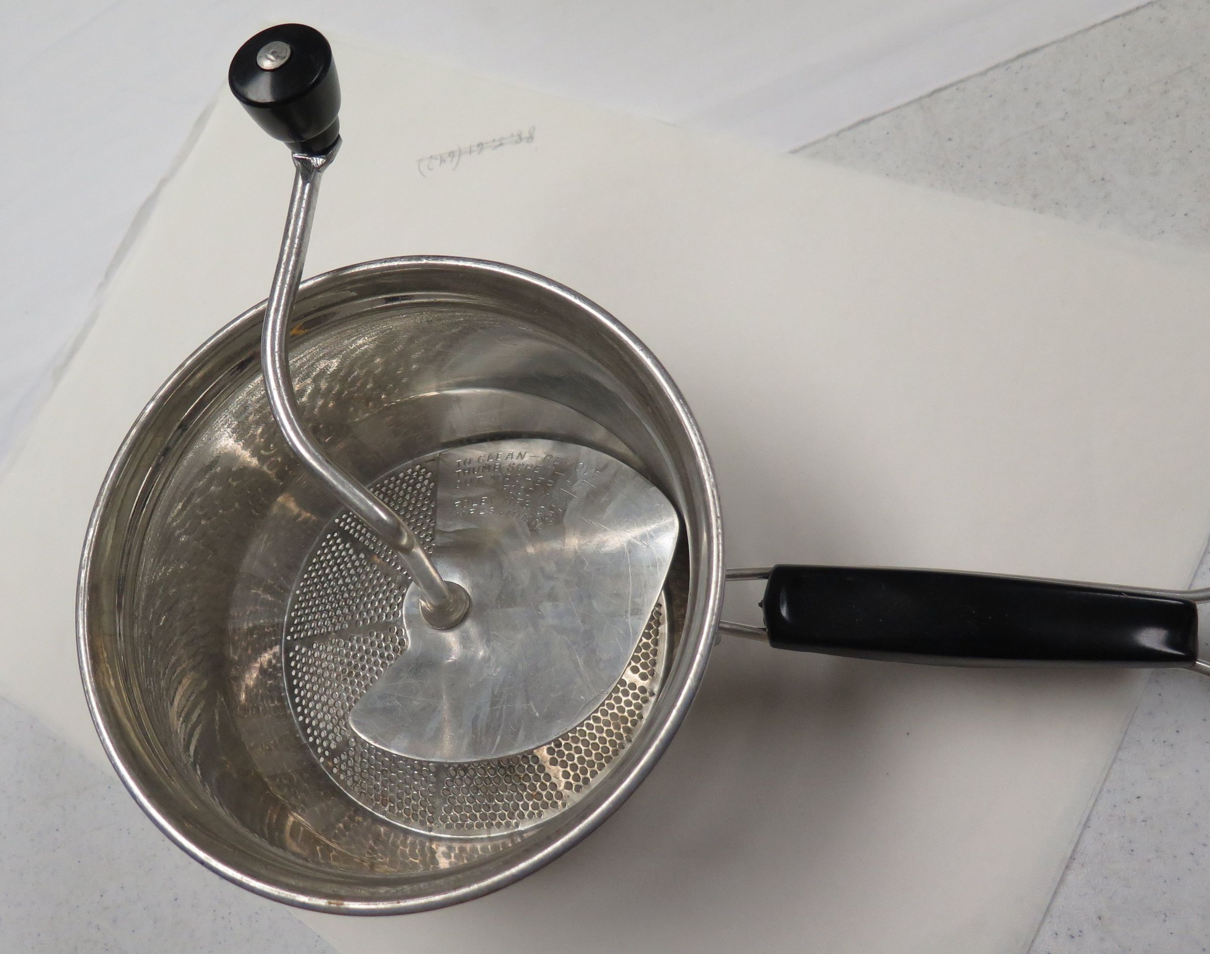 This metal food mill measures 7"(H) x 13"(L) x 7.25"(D). It has a black handle and a black crack knob. Found during inventory of kitchen. Registration form for accession 2003.3 is missing. (ITovar)