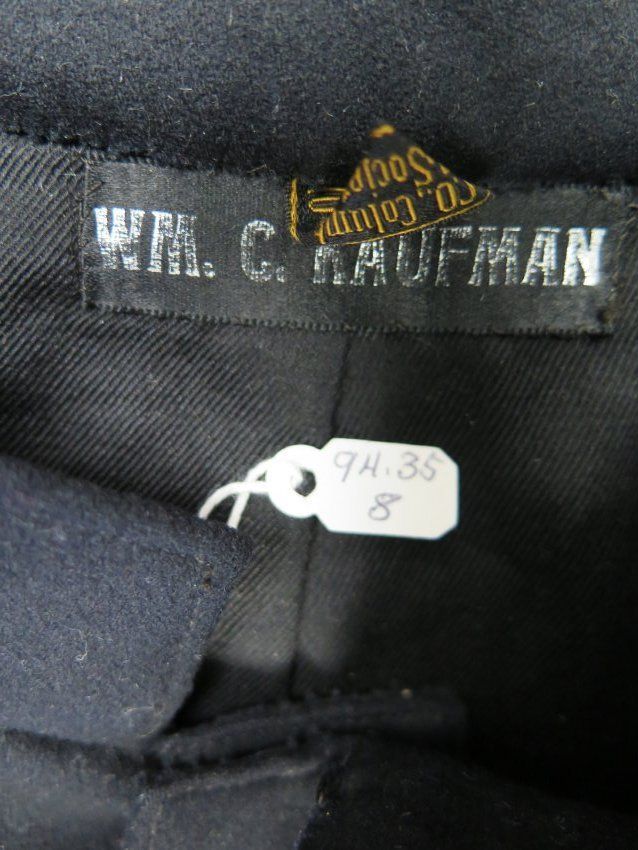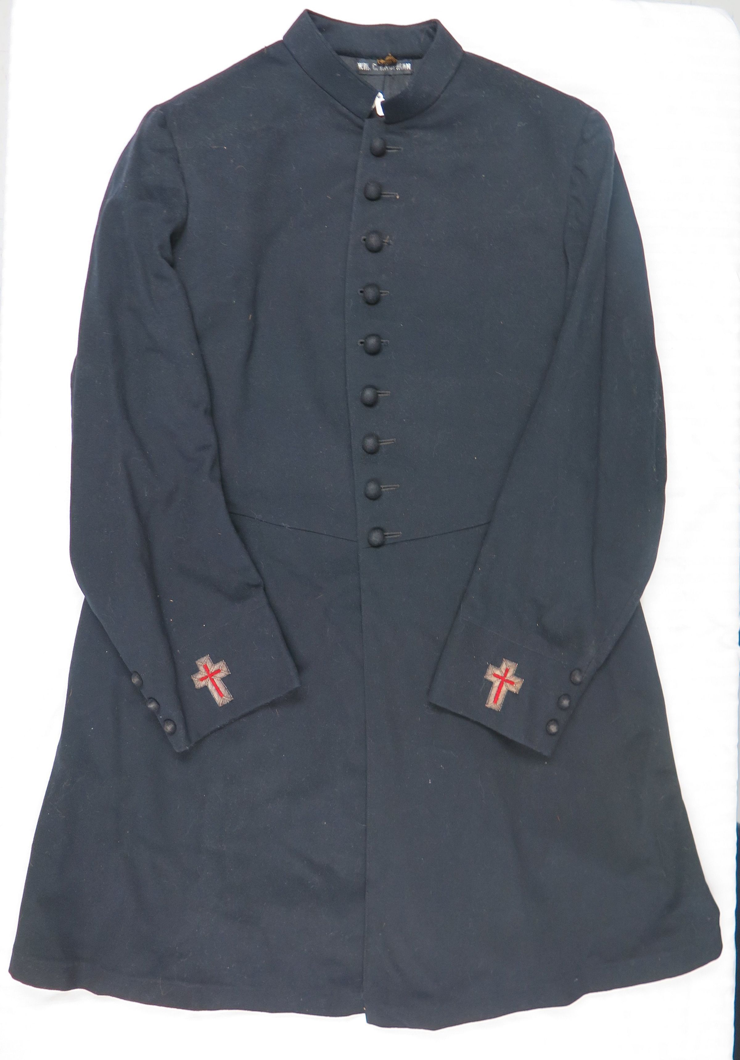 This is a man's black Shriner's coat. The coat has red crosses embroidered at the end of each sleeve and buttons up the front. The coat measures 17" (w) x 39" (l).