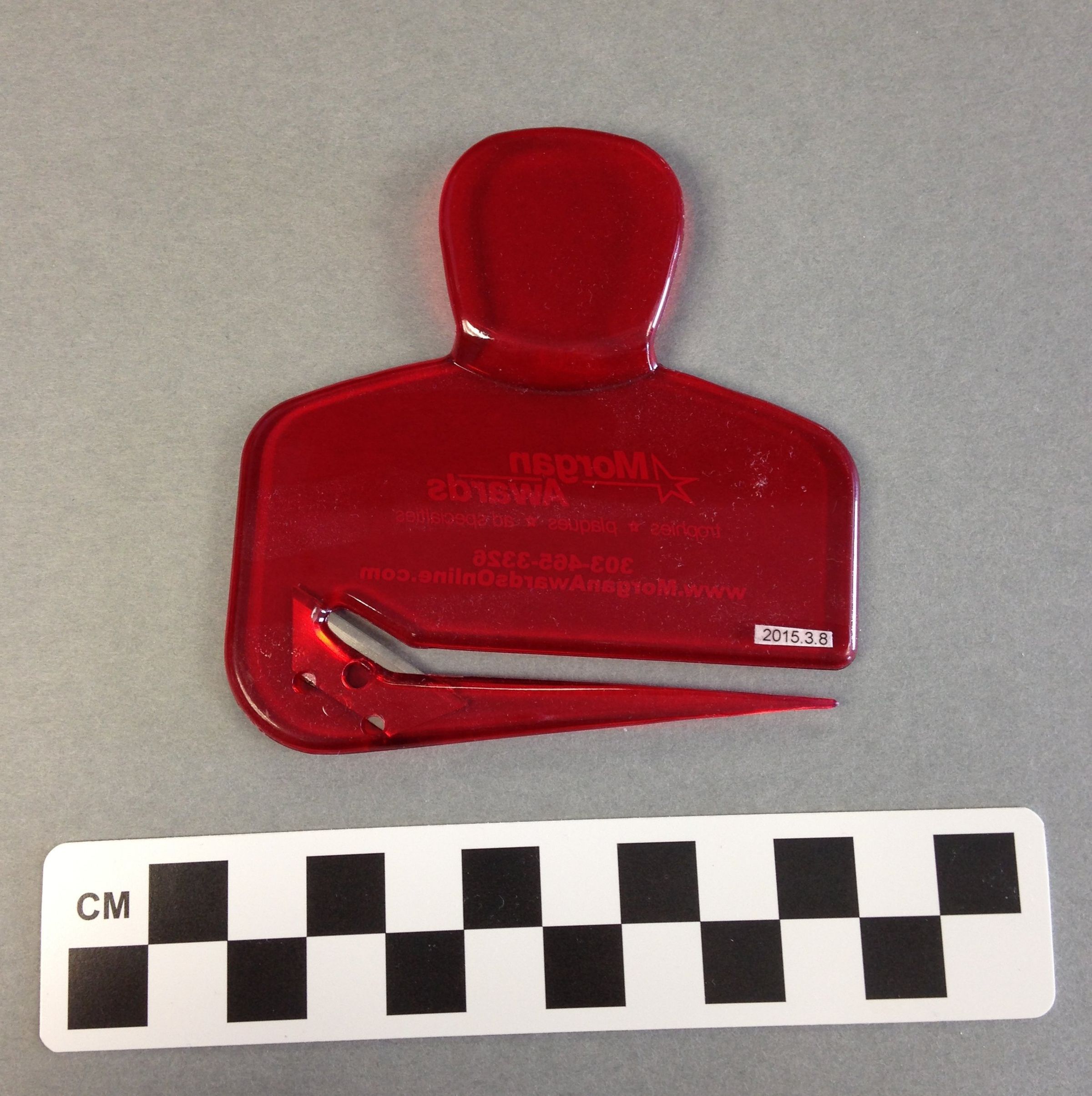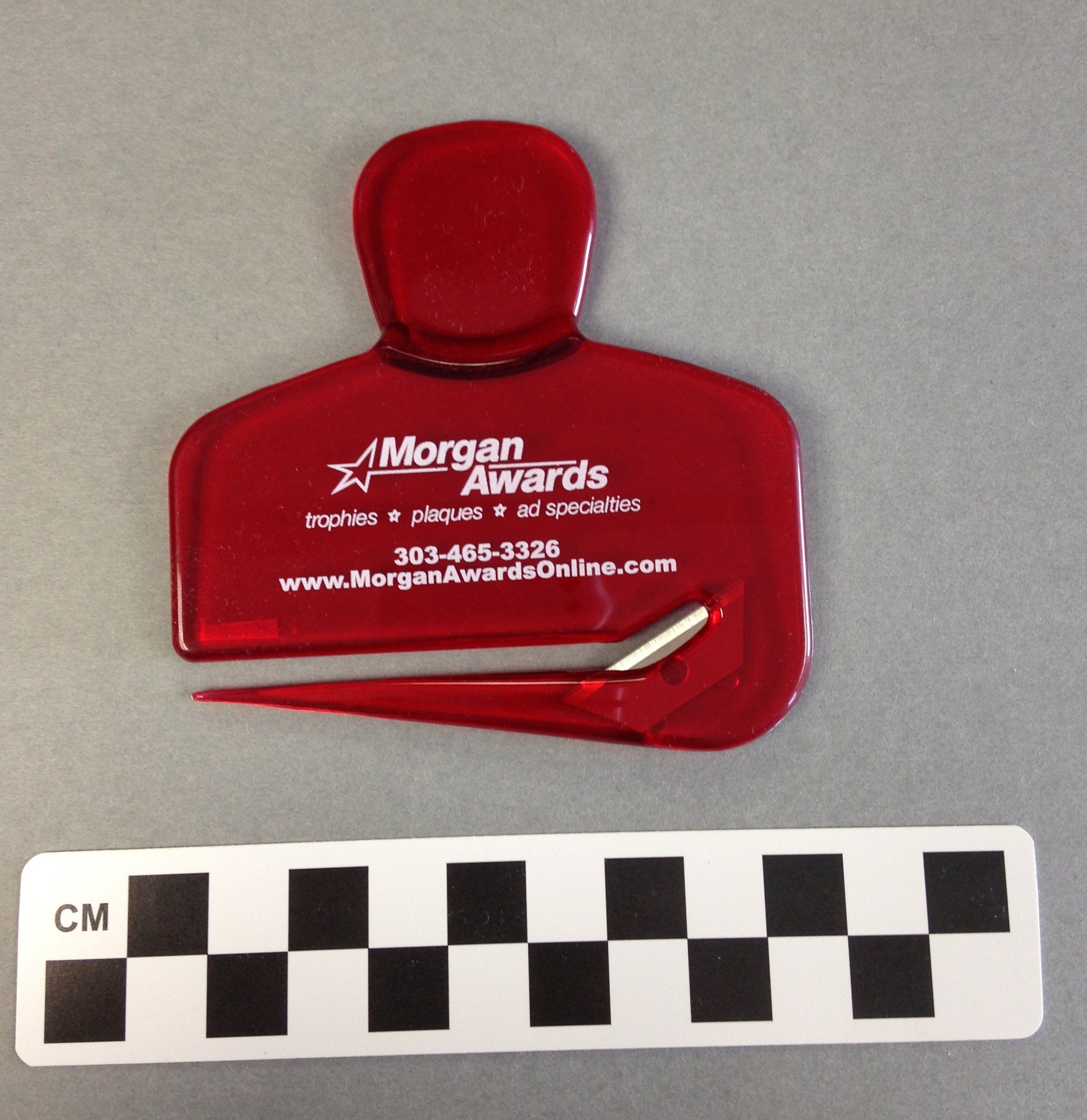 This is a red transparent hard plastic letter opener. "Morgan Awards" and their contact information is written on the letter opener in white. A razor blade is embedded in the opener to cut open letters. The letter opener measures 3.5" (h) x 3.5" (w).