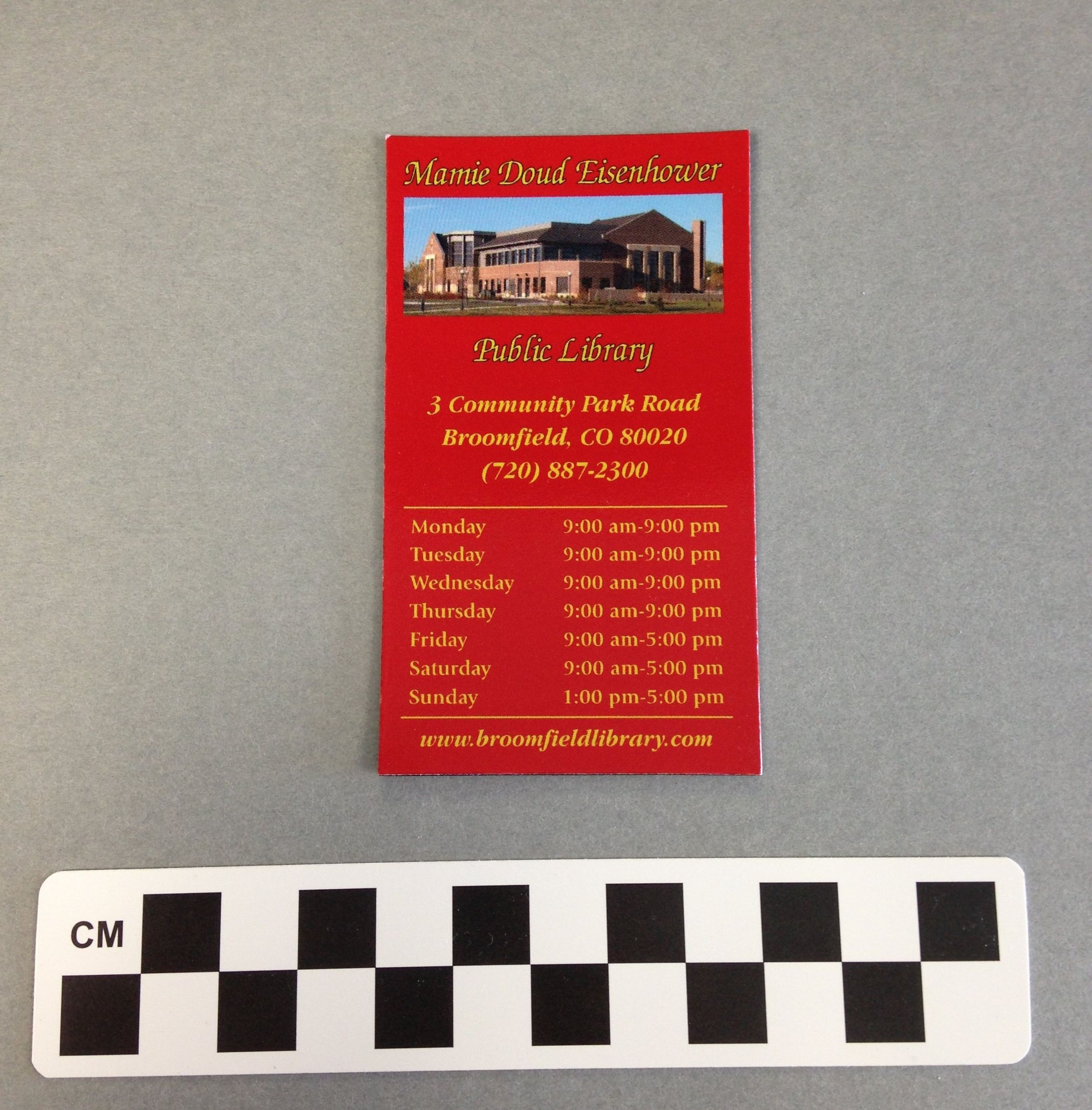 A red thin refrigerator magnet with yellow text, listing the open hours of the Mamie Doud Eisenhower Public Library. A photograph of library is located at the top of the magnet. The magnet measures 3.5" (h) x 2" (w).