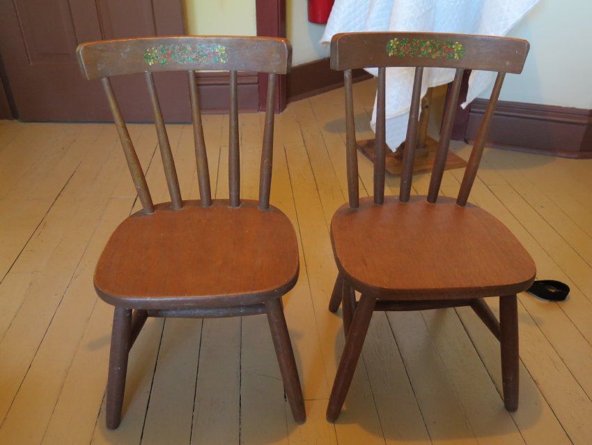 Pair of small wood chairs with flower sticker on both back rests. Dimensions are 23.5" (h) x 13" (w) x 12.5" (l).