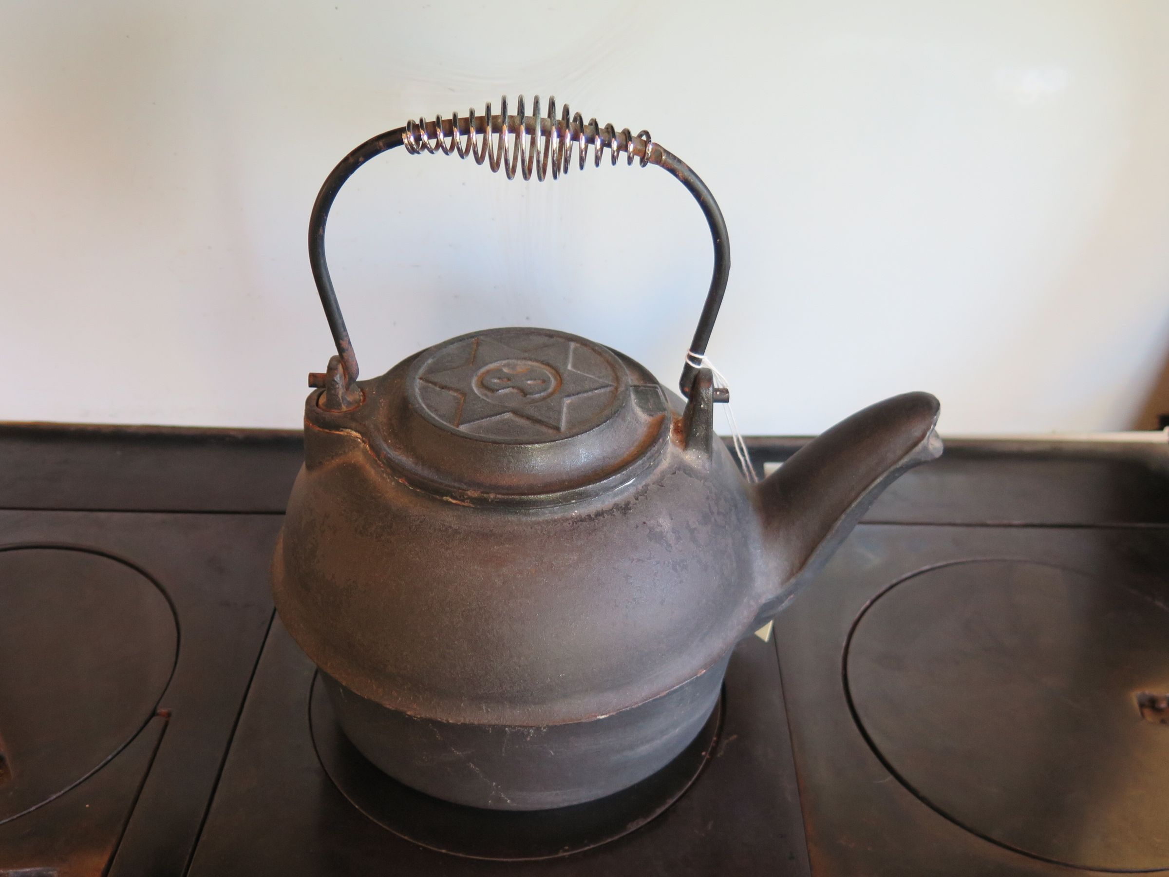 Wood stove top humidifier in the shape of a tea kettle. Heavy cast iron with handle. The humidifier measures 12" (h) x 12" (w) x 10" (l).