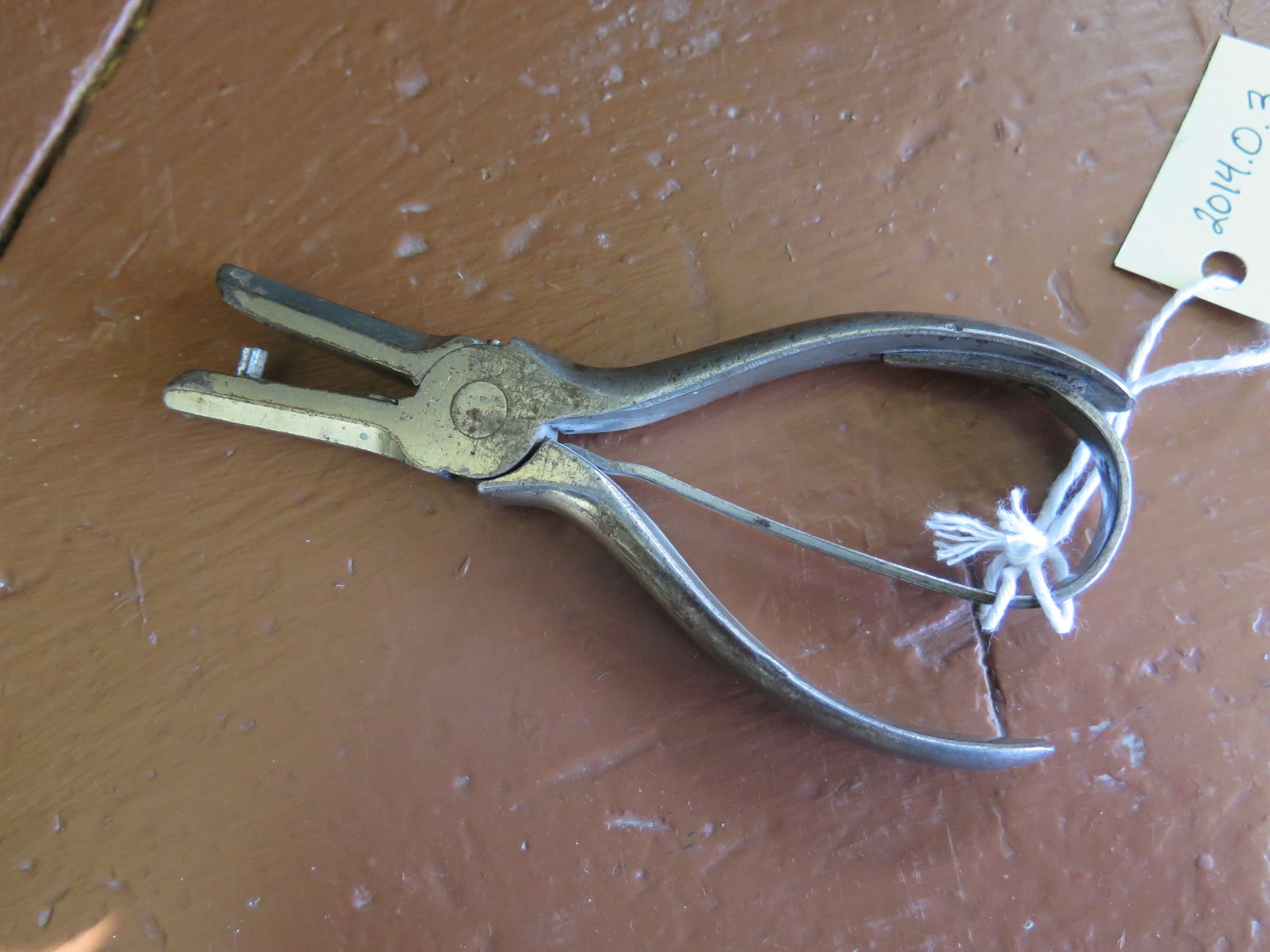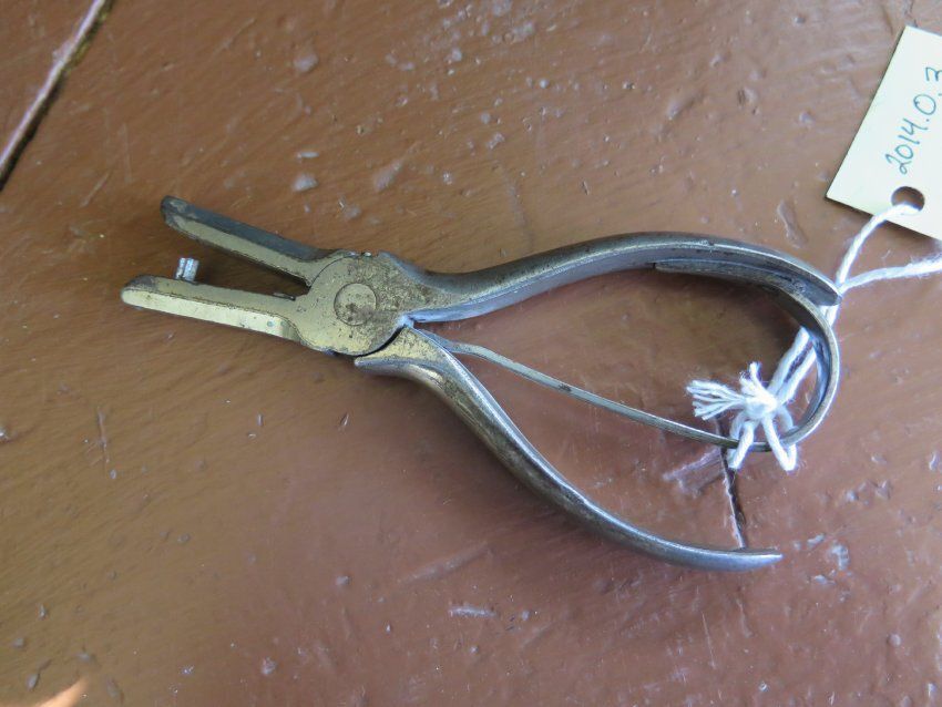 Metal ticket punch used by conductors on train cars to punch rider's tickets indicating that they had used the trip they had paid for. It punches the shape of a star into the ticket. The paper punch measures 0.75" (h) x 2" (w) x 5" (l).