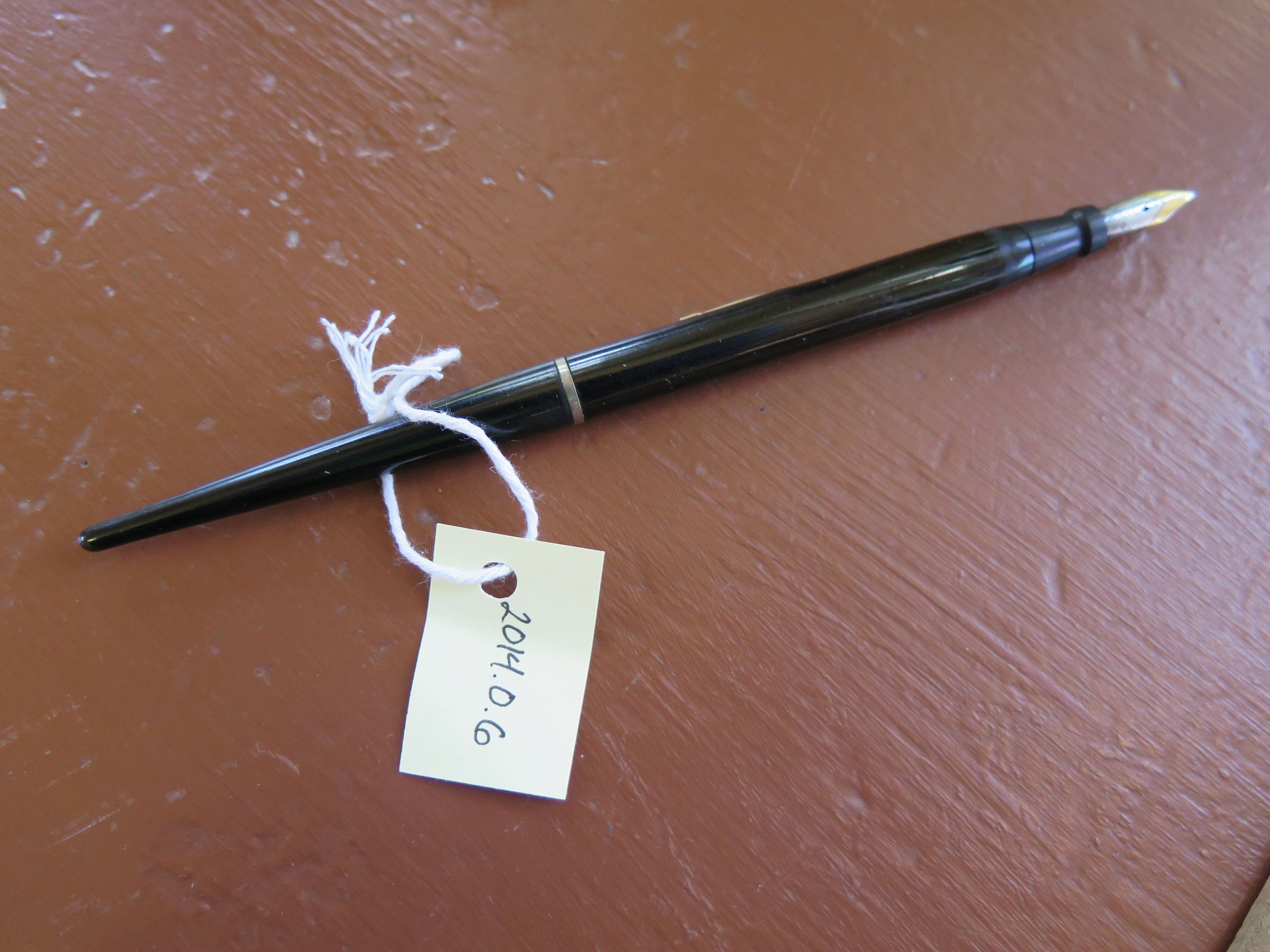 Hard plastic or rubber body with metal nib, ink is added to a reservoir within body of the pen by the thin metal lever at the center of the pen. The pen measures 0.5" (w) x 7.5" (l). This style of fountain pen was invented in the 1940s and remained popular through the 1960s when ball point pens became cheaper and more reliable.