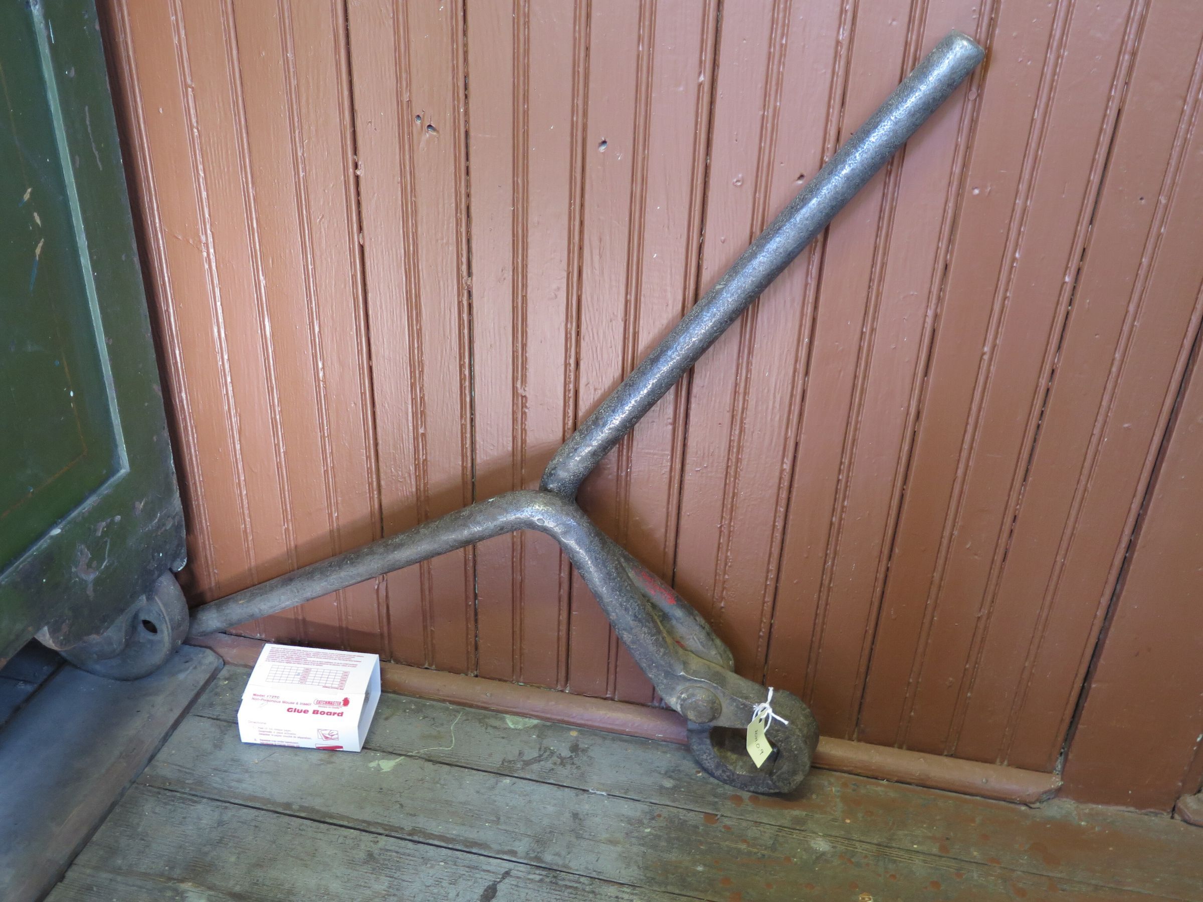Very large and heavy rail tong, used to move track, needed two people to operate, one on each arm on the tongs. Multiple people and rail tongs used to move a single section of rail.