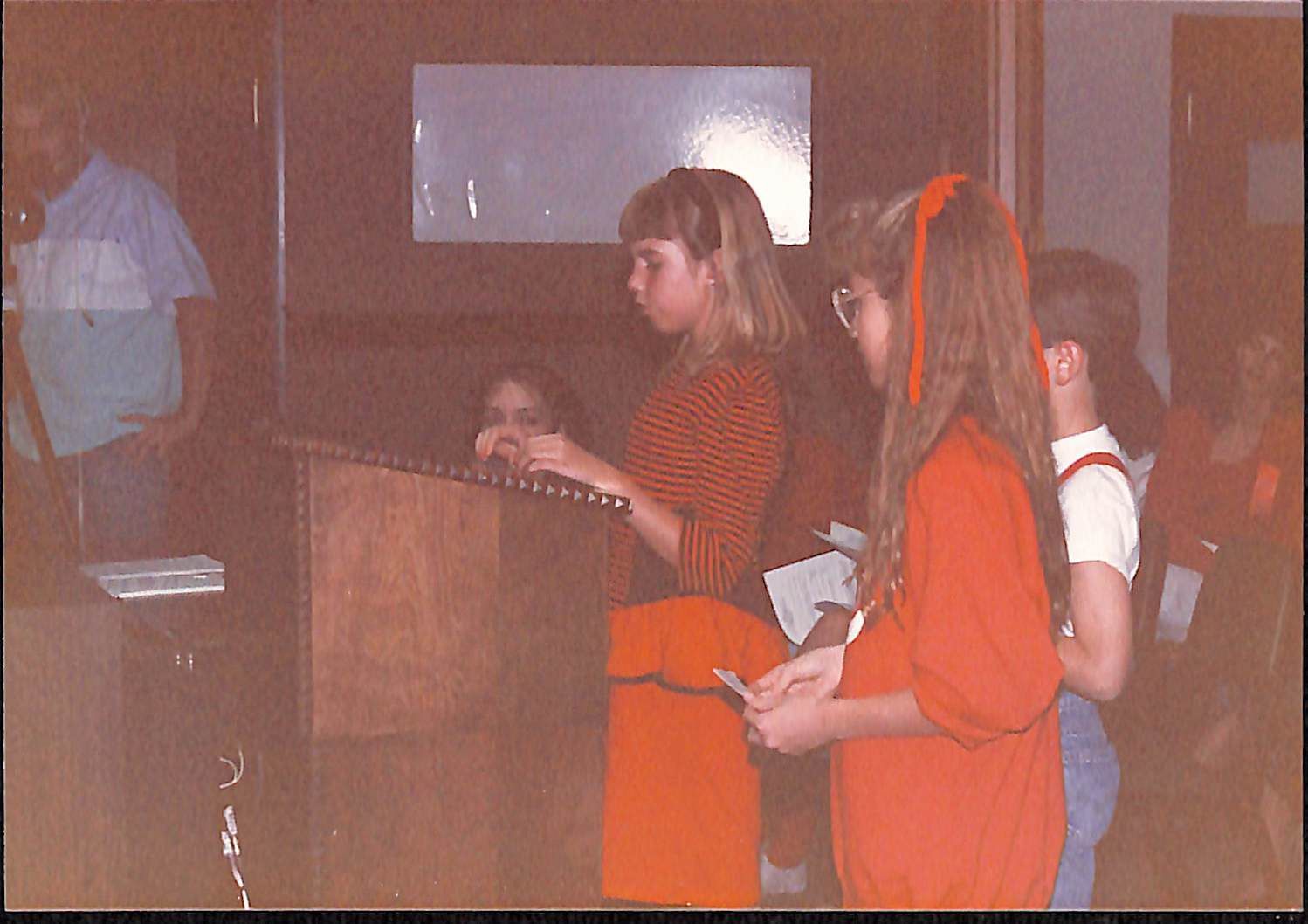 Item is a photograph printed on Kodak paper most likely taken sometime during the late 1980s or early 1990s. The photo centers around three teenage girls, likely members of the Teen Task Force, standing in front of a brown podium as they present to Broomfield City Council. The girl on the left is wearing and red-and-black striped shirt and is currently speaking, while the girls behind her, one wearing a red sweatshirt and the other wearing a white t-shirt and jeans, are preparing their notecards. They are standing in a room with a whiteboard on the wall, and people are sitting behind them, watching the proceedings. A man in a multicolored shirt stands off to the left.Photograph Details