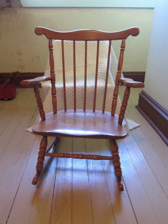 Wooden child-sized rocking chair. "Oak Hill Fitchburg Mass." printed on back of back rest. The chair measures 27.5" (h) x 20.5" (w) x 21" (d).