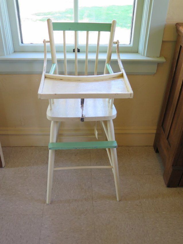 This is a green and white painted wooden highchair. There is a cloth strap creating a division that either leg would have gone on one side of. This strap is frayed in the middle. The highchair measures 39" (h) x 16.5" (w) x 13" (d).