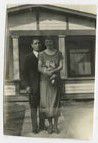 Black and white photograph of a couple standing on a pathway to a house. The man is wearing a black suit. The woman is wearing a dark grey dress and holding a bouquet of flowers. The two people are probably Lester C. Brunner and Lib Brunner. In the background is a single-story house with a covered patio.
