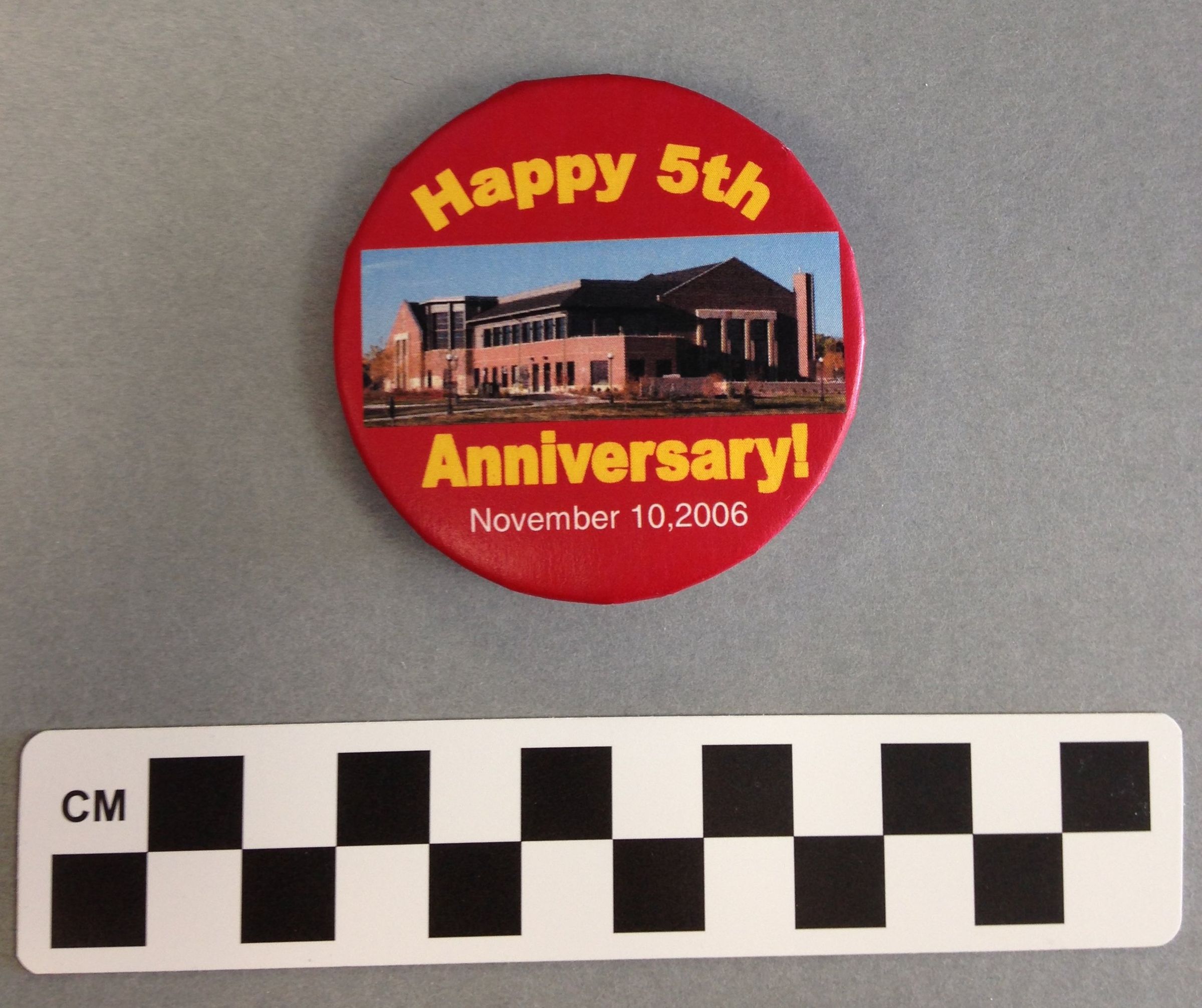 A round pin with a photograph of the Mamie Doud Eisenhower Public Library at the center. There is yellow text around the edges saying "Happy 5th Anniversary" and the date November 10, 2006 in white. The background is red. The back of the pin is metal with "Badge-a-mint" embossed on to it. The pin measures 2.5" (dia).