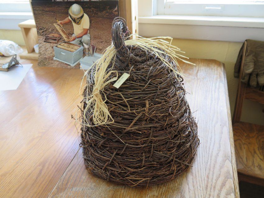 Brown woven bee skep. Looks like it is made of twigs. There is a handle at the top that has straw tied around it. The skep measures 15.5" (h) x 13.5" (diam).