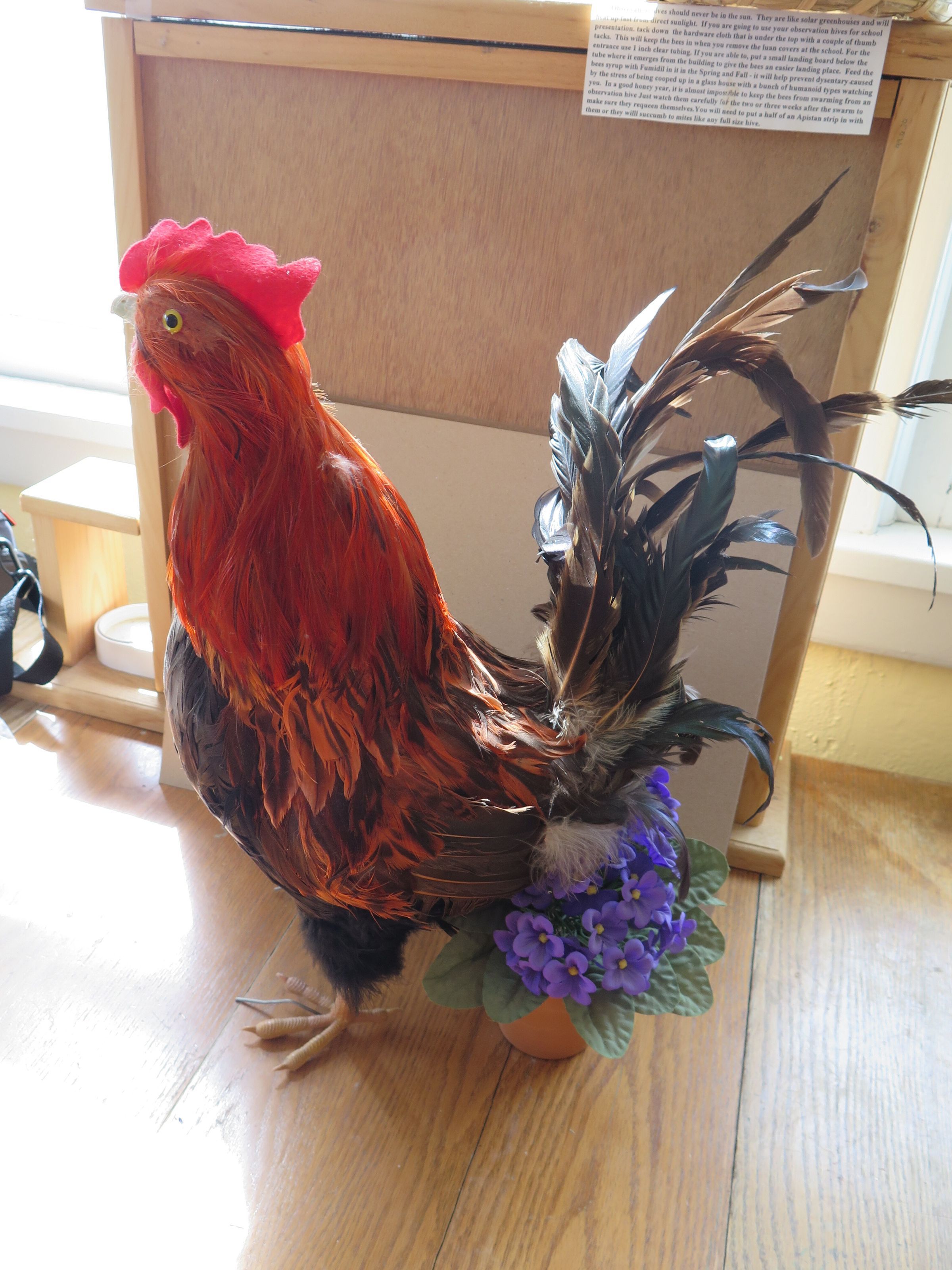 This is a rooster figurine. The rooster has a plastic beak, eyes, and feet. The head ornamentation is made of red felt. The rooster is covered in real feathers. The rooster measures 19" (h) x 7" (w) x 12" (d).Collection