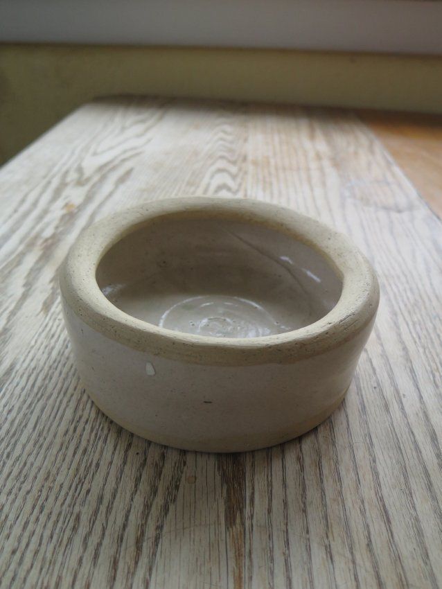 This is a shallow cream colored crock dish. The outside edge has been glazed. The crock measures 2.5" (h) x 6.25" (diam).
