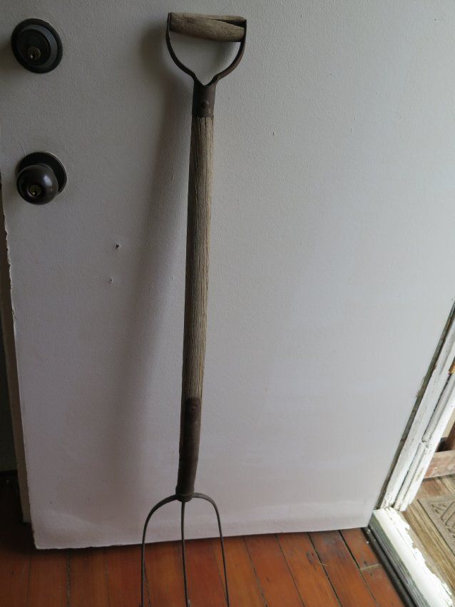 This is a metal 3 prong hay lifting fork with a wooden shaft and a metal handle. The fork measures 44" (h) x 7.5" (w).