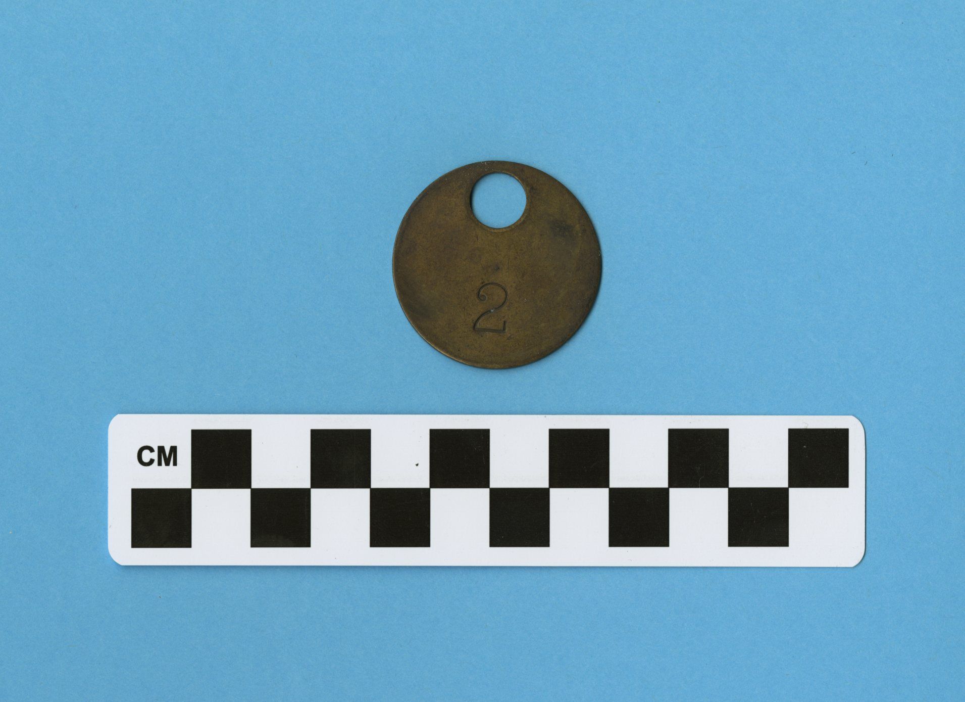 This is a check tag from a coal mine in the Appalachia region of the U.S. They are also called miner's checks, pit tags, pit checks or time checks. It is a small round brass disk with a hole punched at the top and the number 2 etched into it. The tag measures 1.5" (diam).