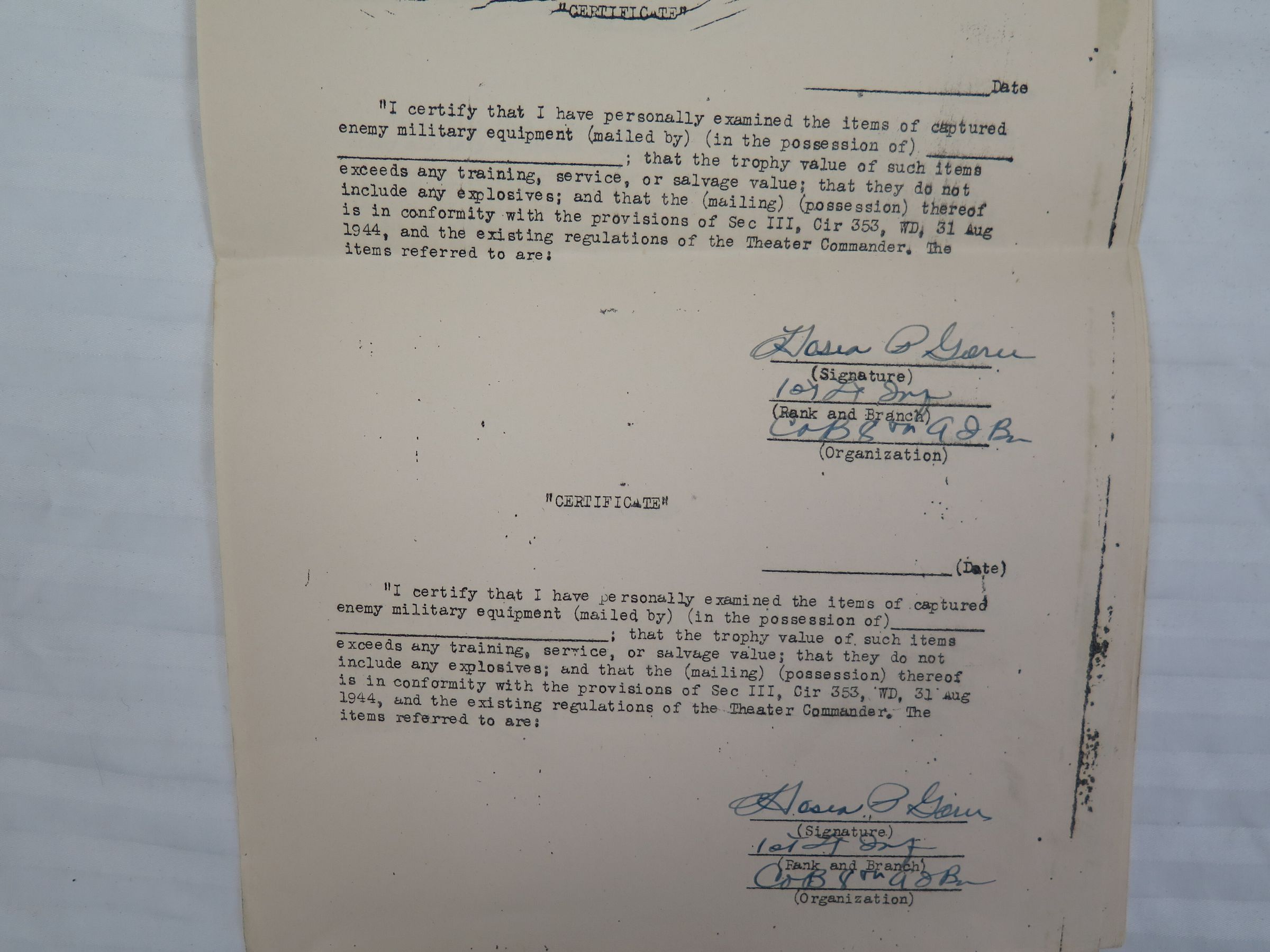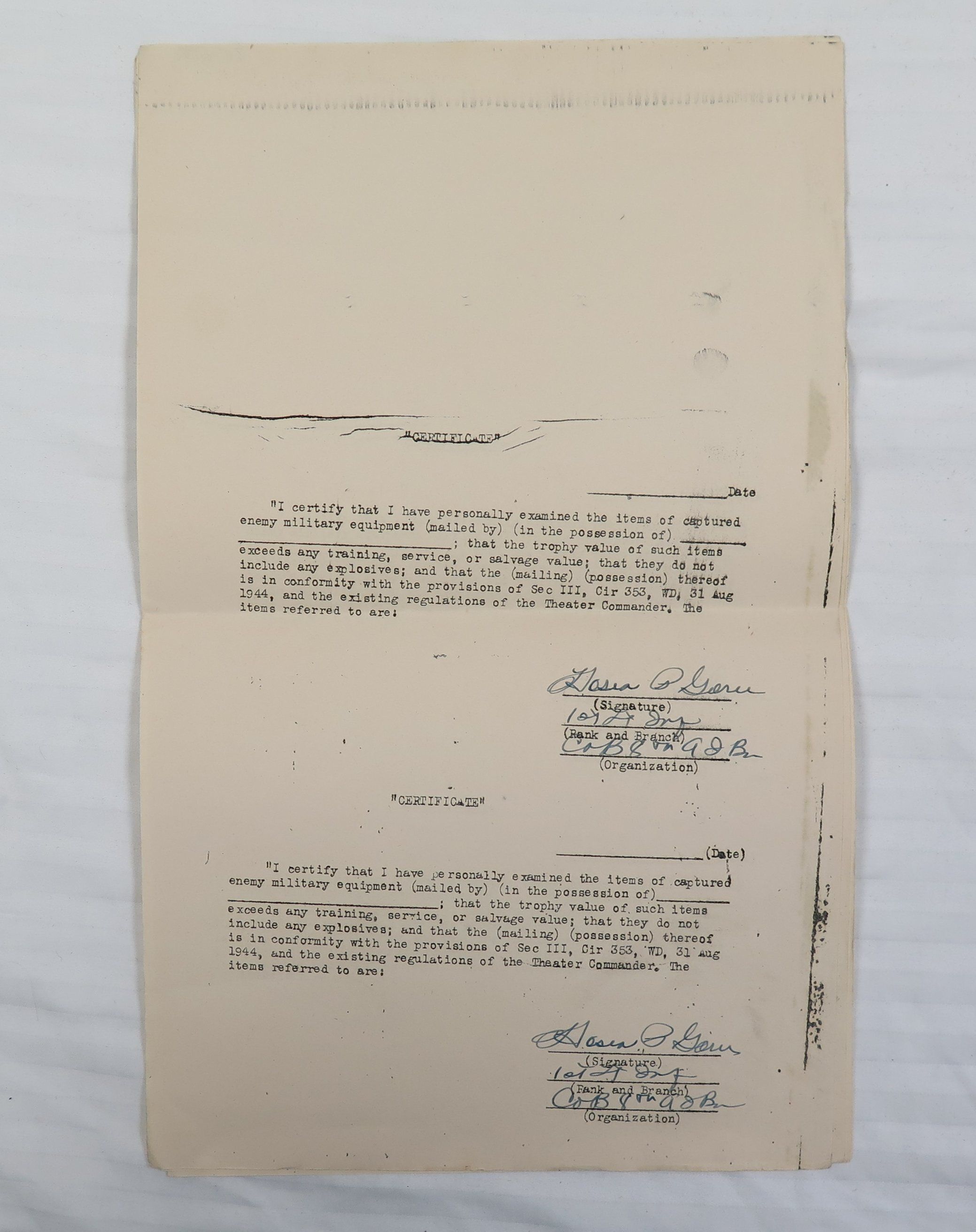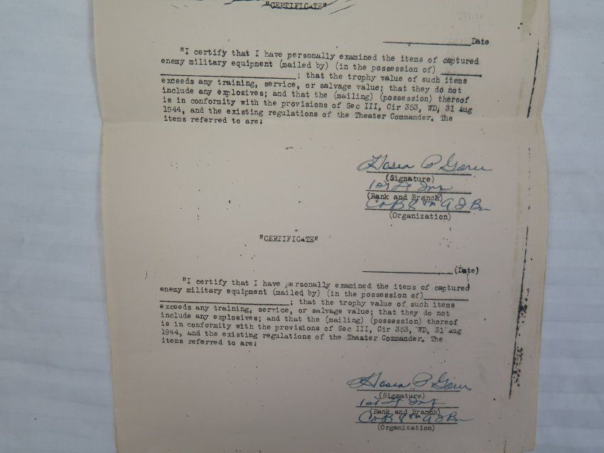 This is a set of 6 certificates releasing captured military equipment. There are two certificates on each of the three pages. All of the certificates are signed, but none of them are filled out. The pages each measure 8" (w) x 13" (l).Collection