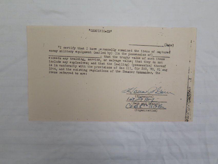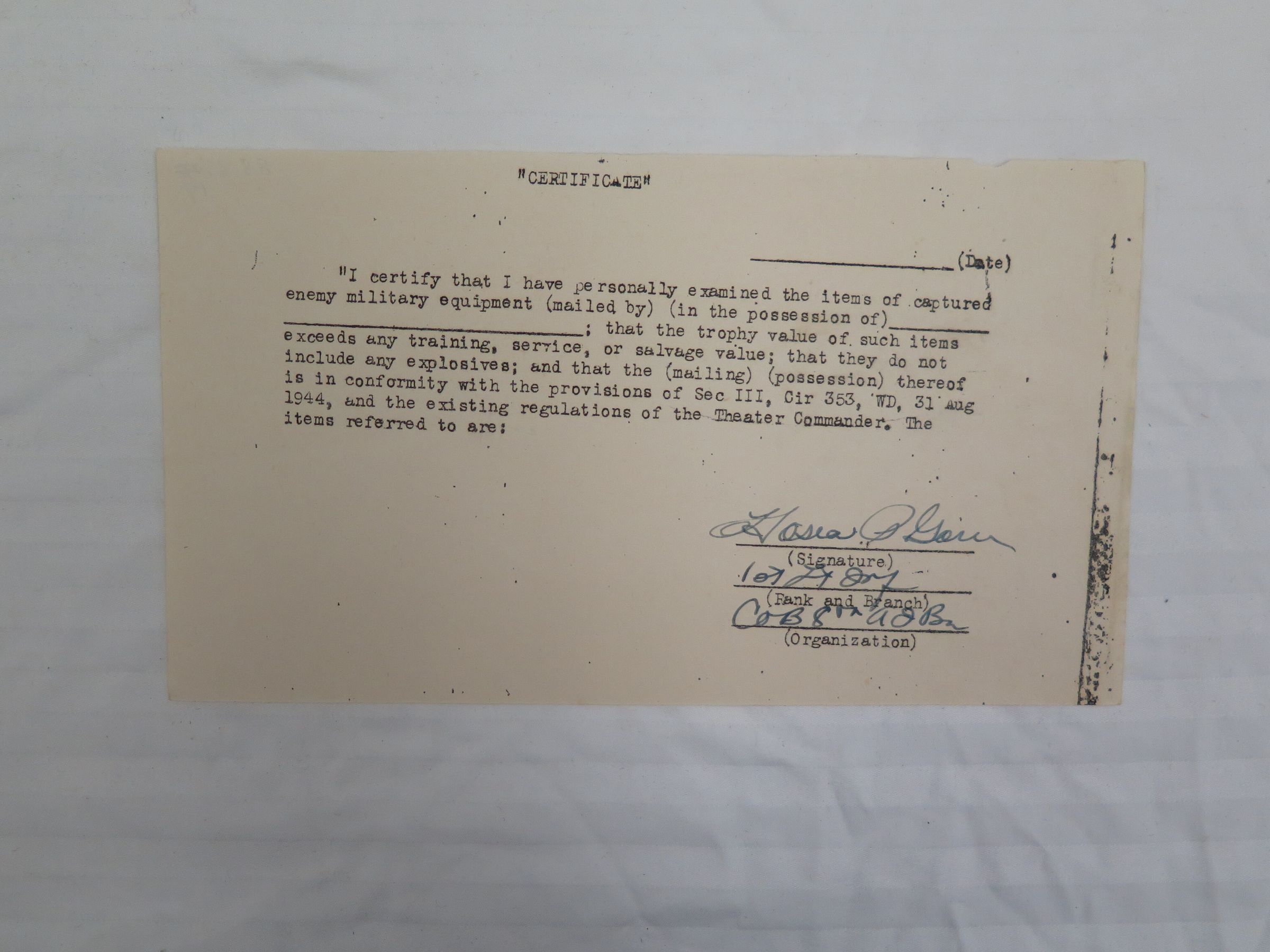 This is a certificate releasing captured military equipment. The certificate is signed, but not filled out. The certificate measures 8" (w) x 4.5" (l).
