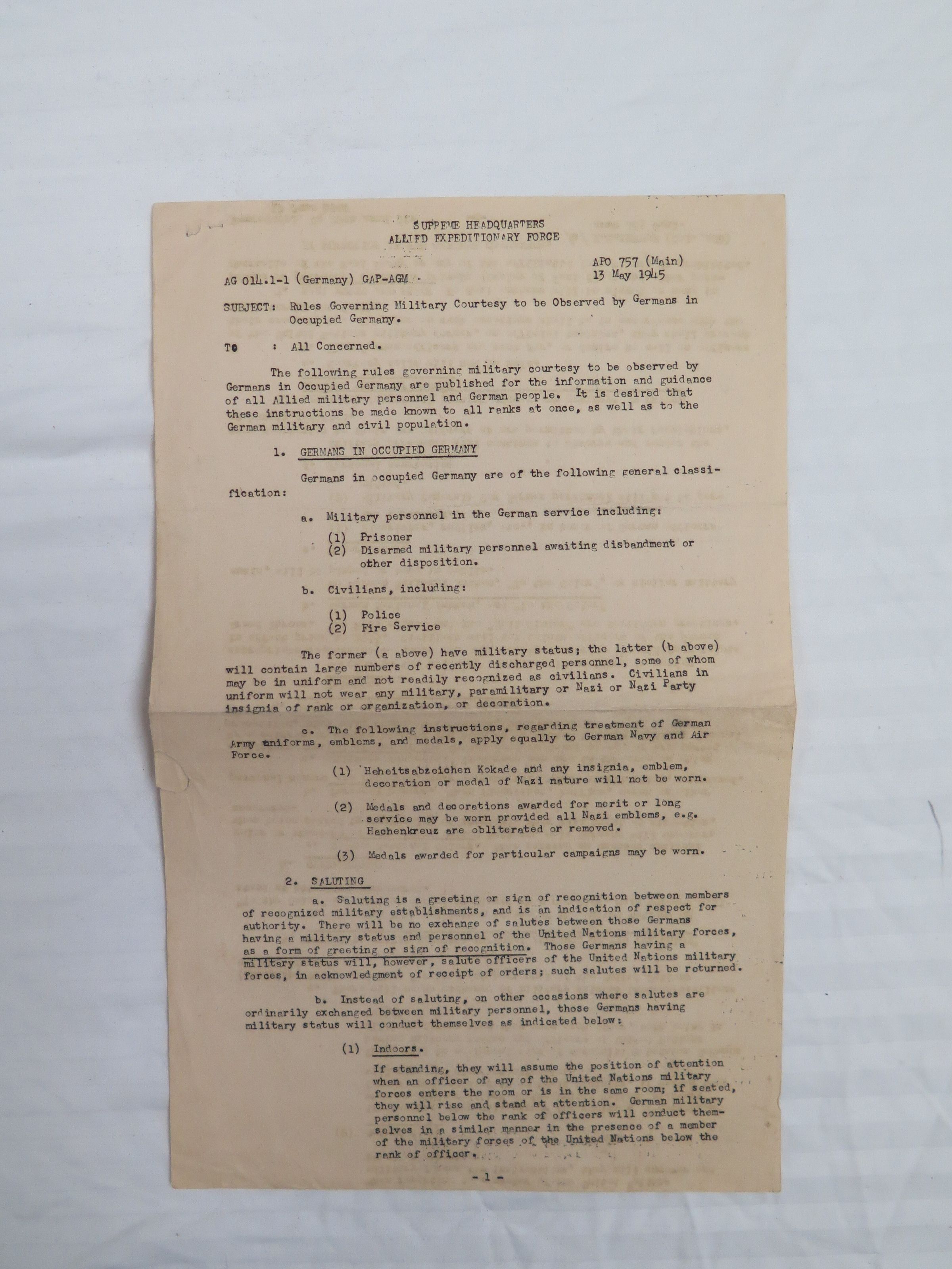 This is a document of printed Rules Governing Military Courtesy to be Observed by Germans in Occupied Germany from APO 757 (Main) on May 13, 1945. There is printing on both sides of the page. The document measures 8" (w) x 13" (l).Collection