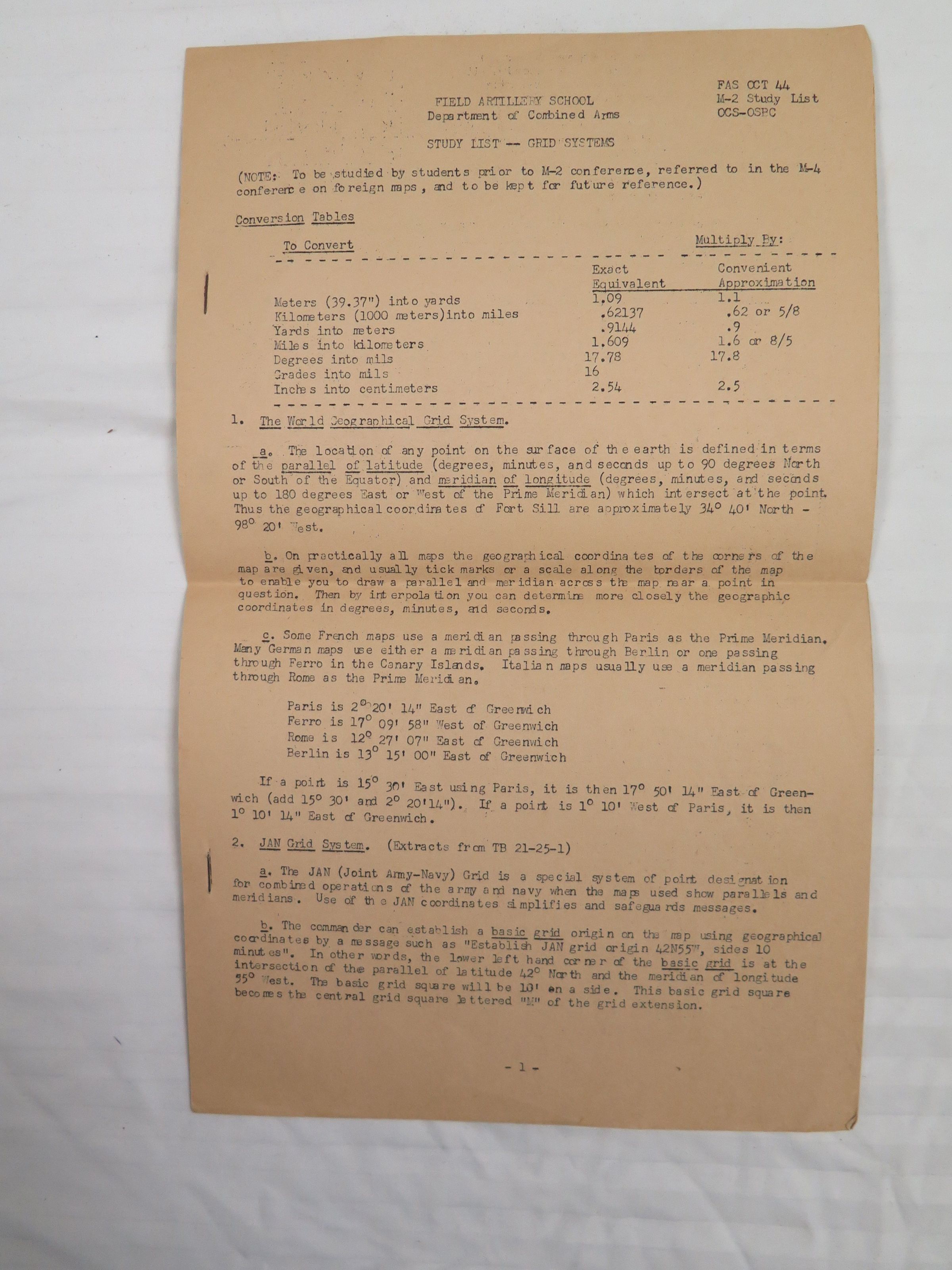 This is a printed field artillery school study list of grid systems. The document is made up of 2 sheets of paper, with the first being printed on the front and the back. The list measures 8" (w) x 13" (l).Collection