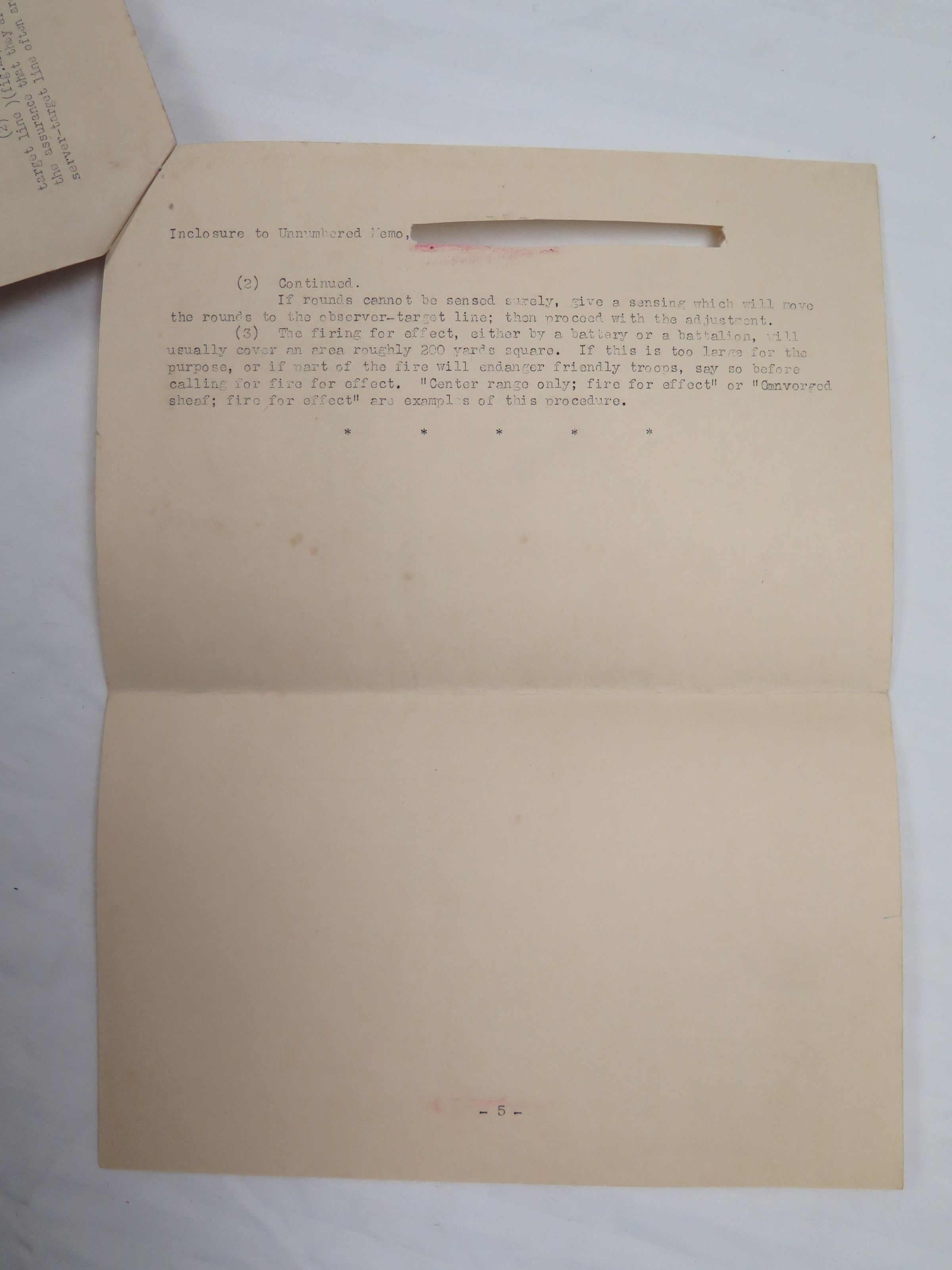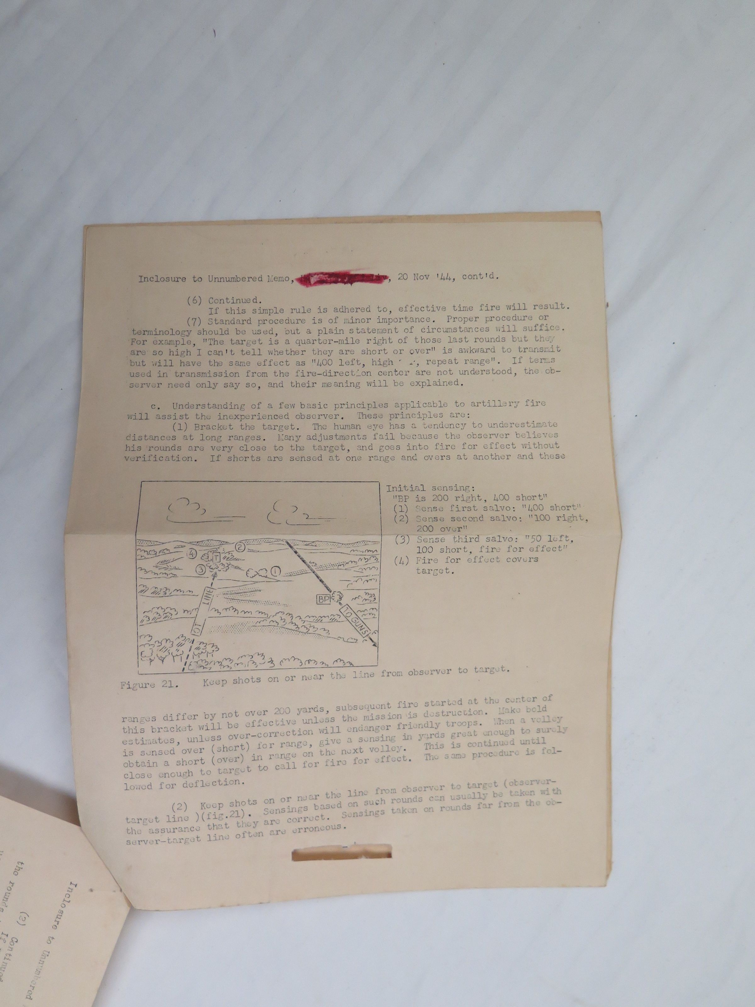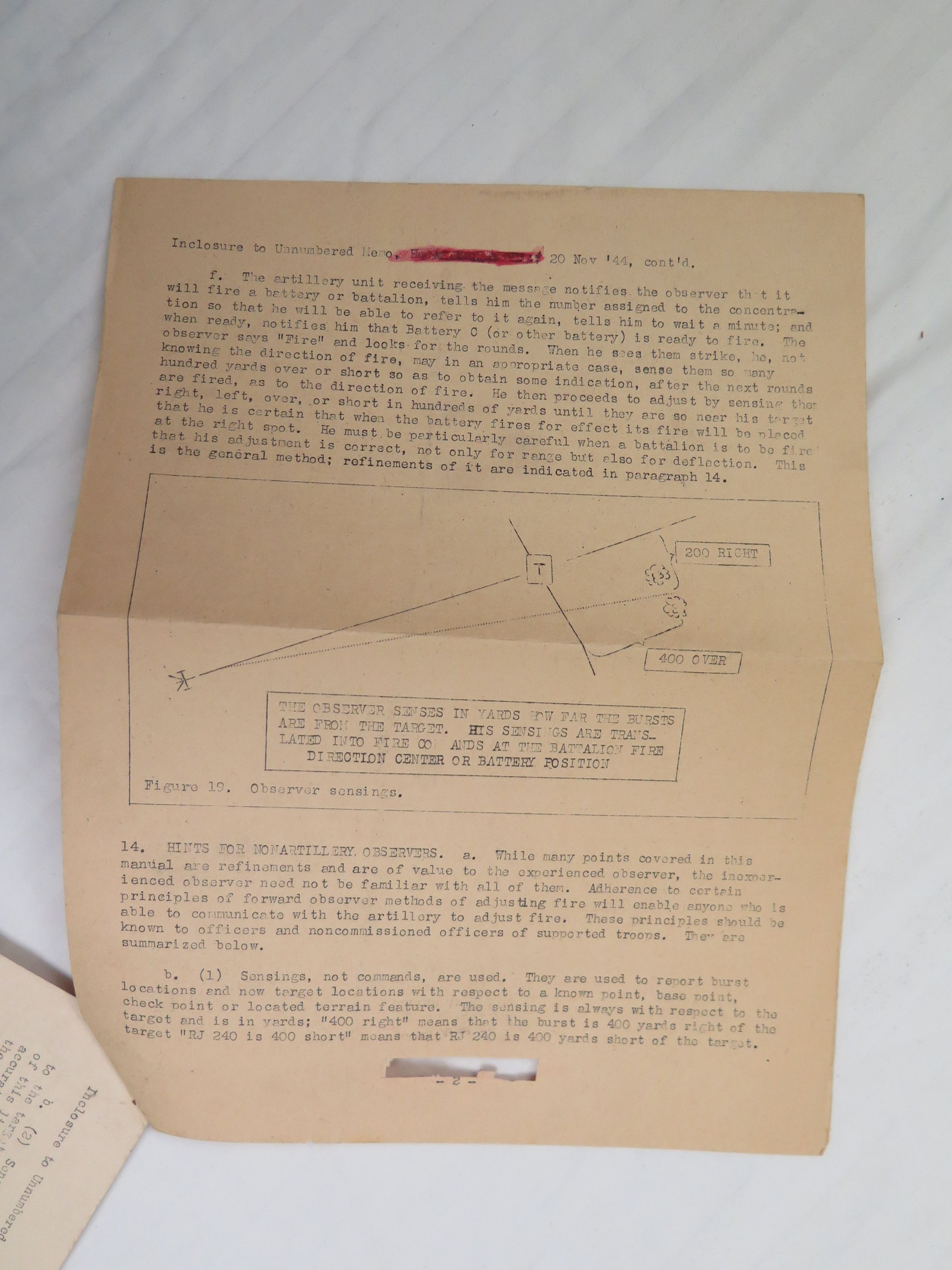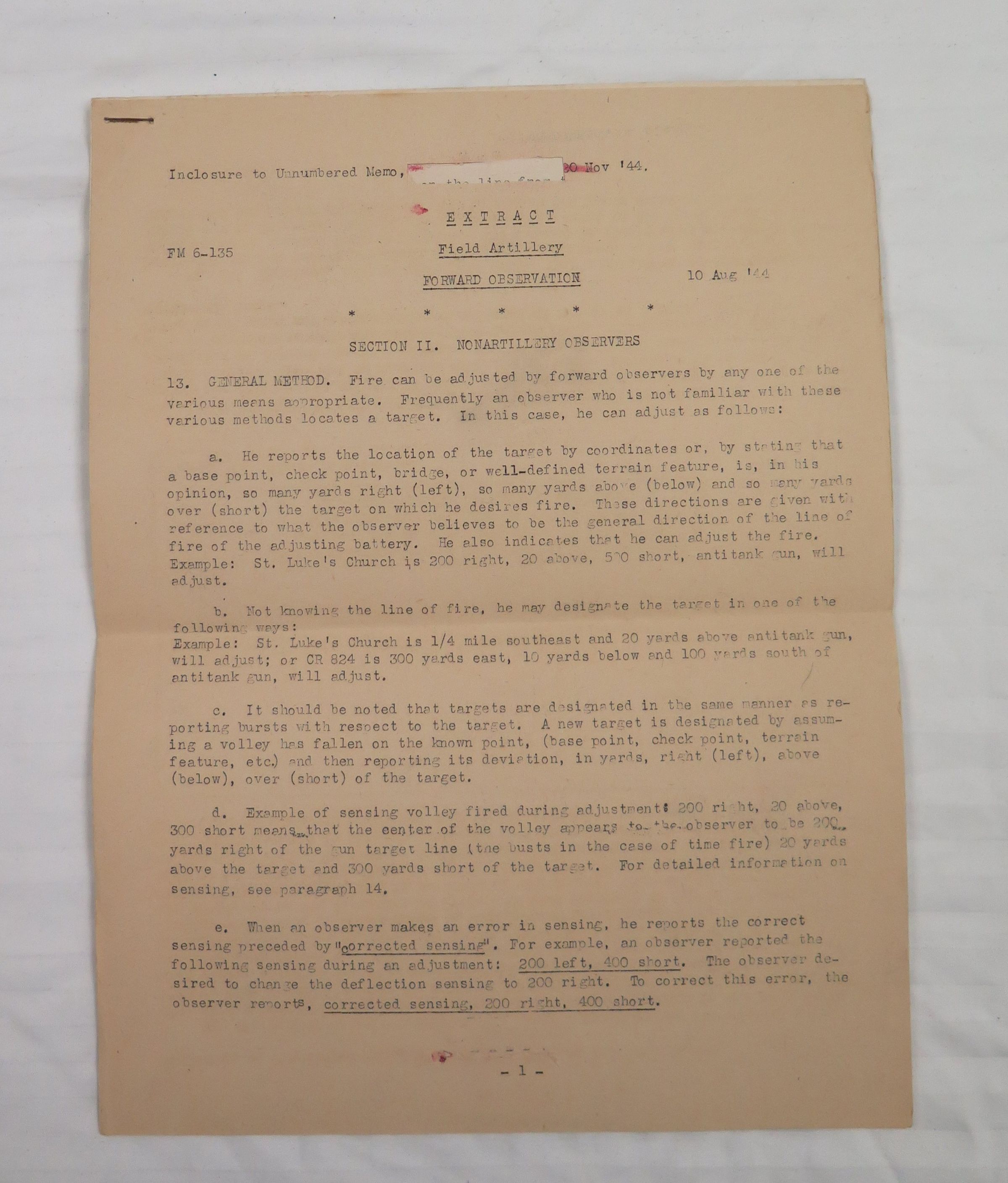 This is printed military instructions for field artillery. The document was written on August 10, 1944. It outlines procedures with a reference to a memo, but the memo number has been cut out. The referenced memo was from Nov. 1944. The document is a supplement to FM 6-135. The manual is made up of 3 pages, the first two having text on the front and the back. The manual measures 8" (w) x 10.5" (l).Collection