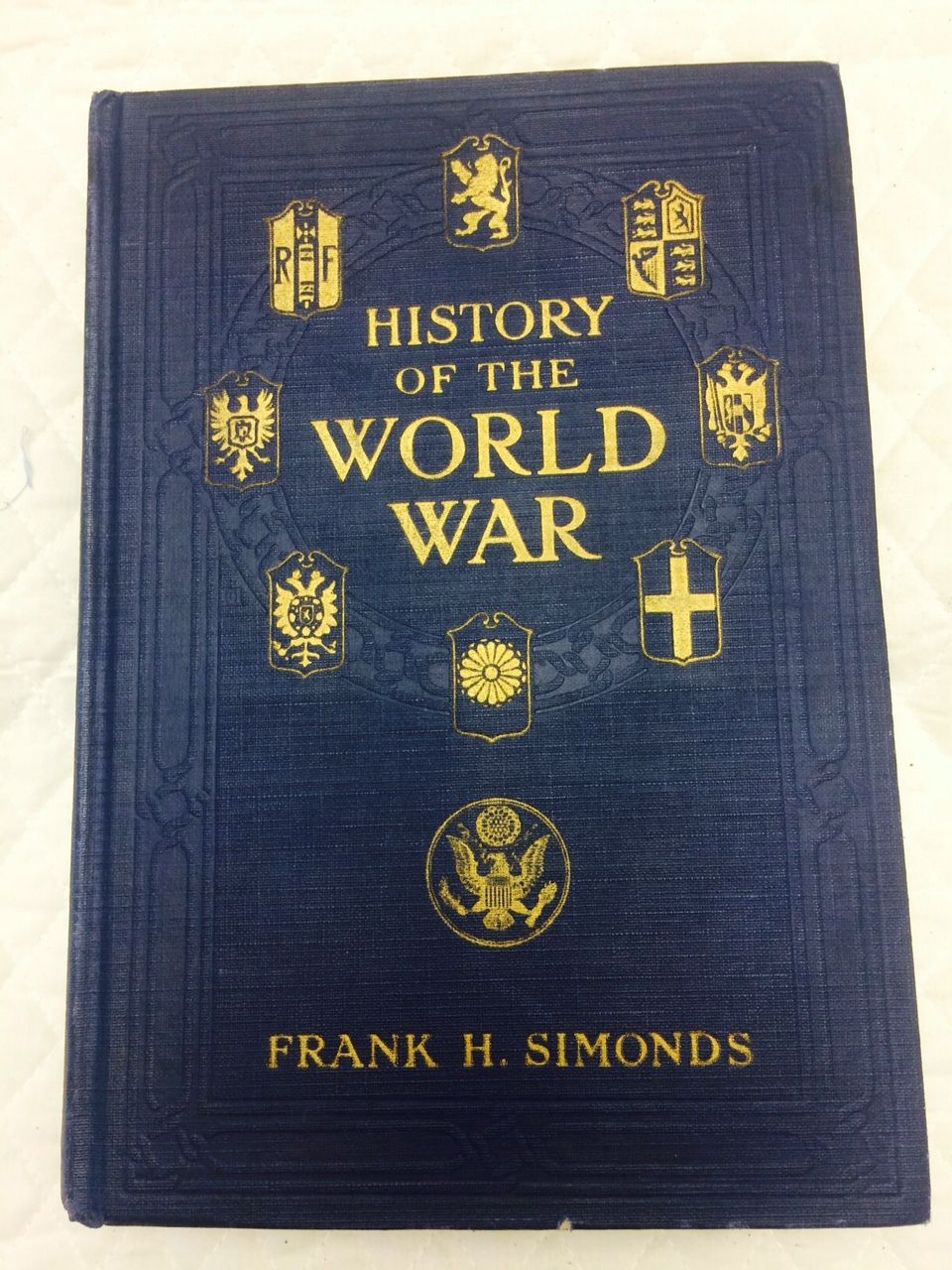 Blue hardcover, glue binding, 7" x 10", 422 pages. The title, "History of the World War" is in gold imprinted lettering on the front, with eight different crests surrounding it in a circle. A United States of America eagle seal is just below the circle of crests. The author's name, "Frank H. Simonds" is at the bottom of the cover.Collection