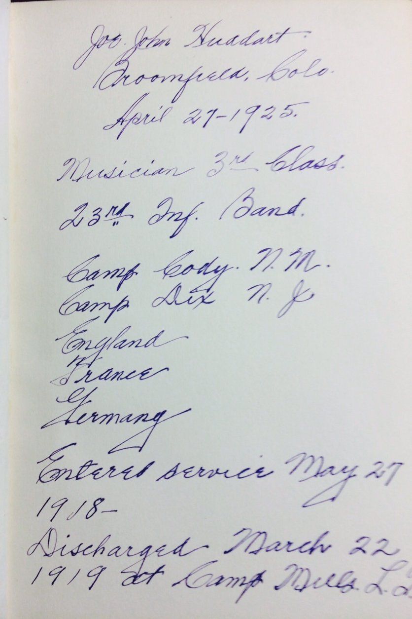 Book titled, "History of the World War" by Frank H. Simonds, published 1920. The book is volume five of a five volume set, detailing the history of World War I and its battles. Color illustrations and maps are also included. The inside cover and first two cover pages have inscriptions in blue ink, written by the book's original owner Joseph Huddart. The inside cover lists Huddart's name, "J.J. Huddart Broomfield Colo. April 23 - 1925." The first page states, "In Memory of my dead mother. Died April 23 1923. Mary Alice Huddart Weldona, Colorado." The second page lists all the places where Huddart was stationed during World War I while he was in the service as a musician, 3rd class. Locations listed include: Camp Cody, New Mexico; Camp Dix, New Jersey; England; France; and Germany. Huddart also listed May 27, 1918 as the date he entered the service, and March 22, 1919 as his date of discharge at Camp Mills. The lettering "L.2." is also listed by his discharge date, possibly referring to a rank of second lieutenant.