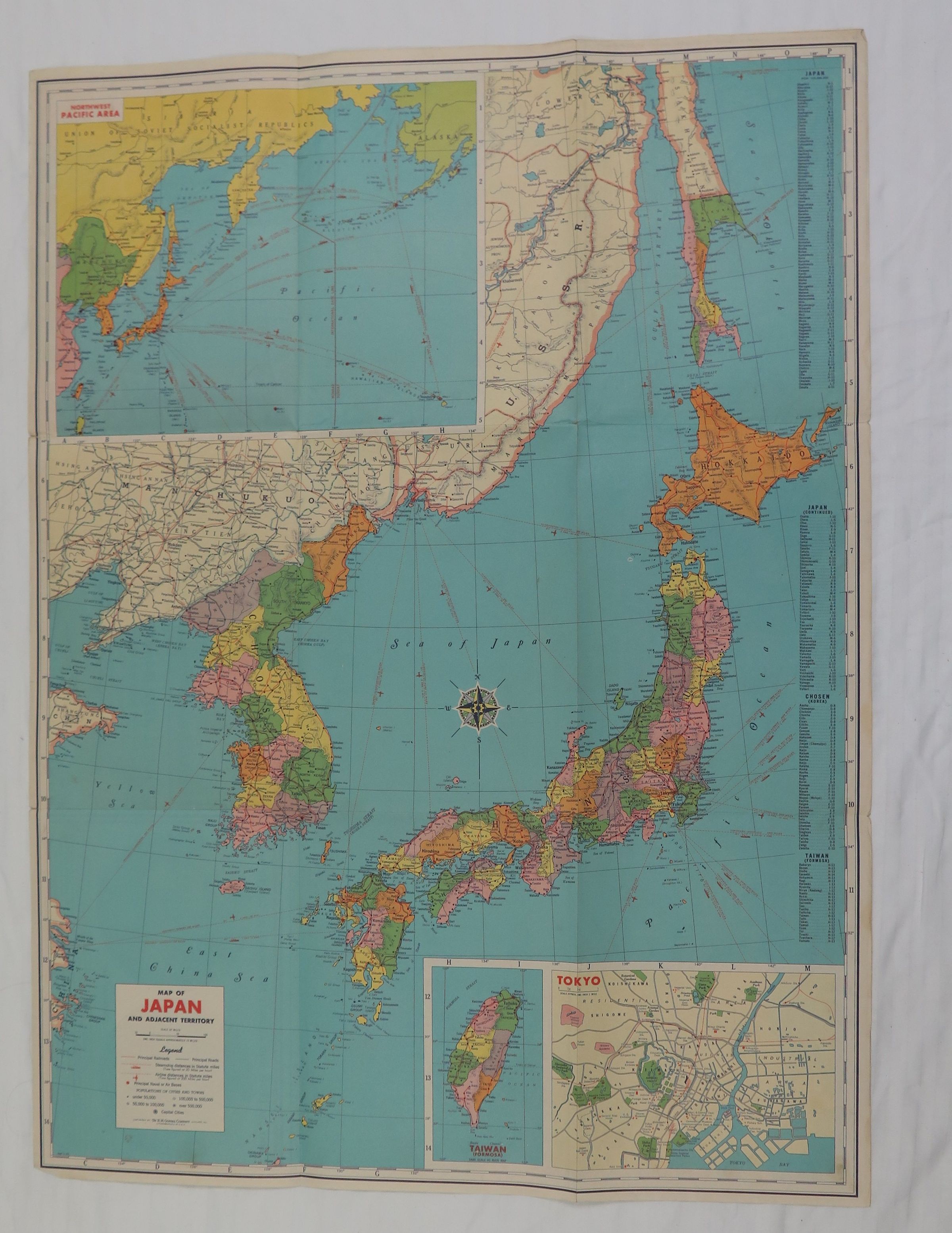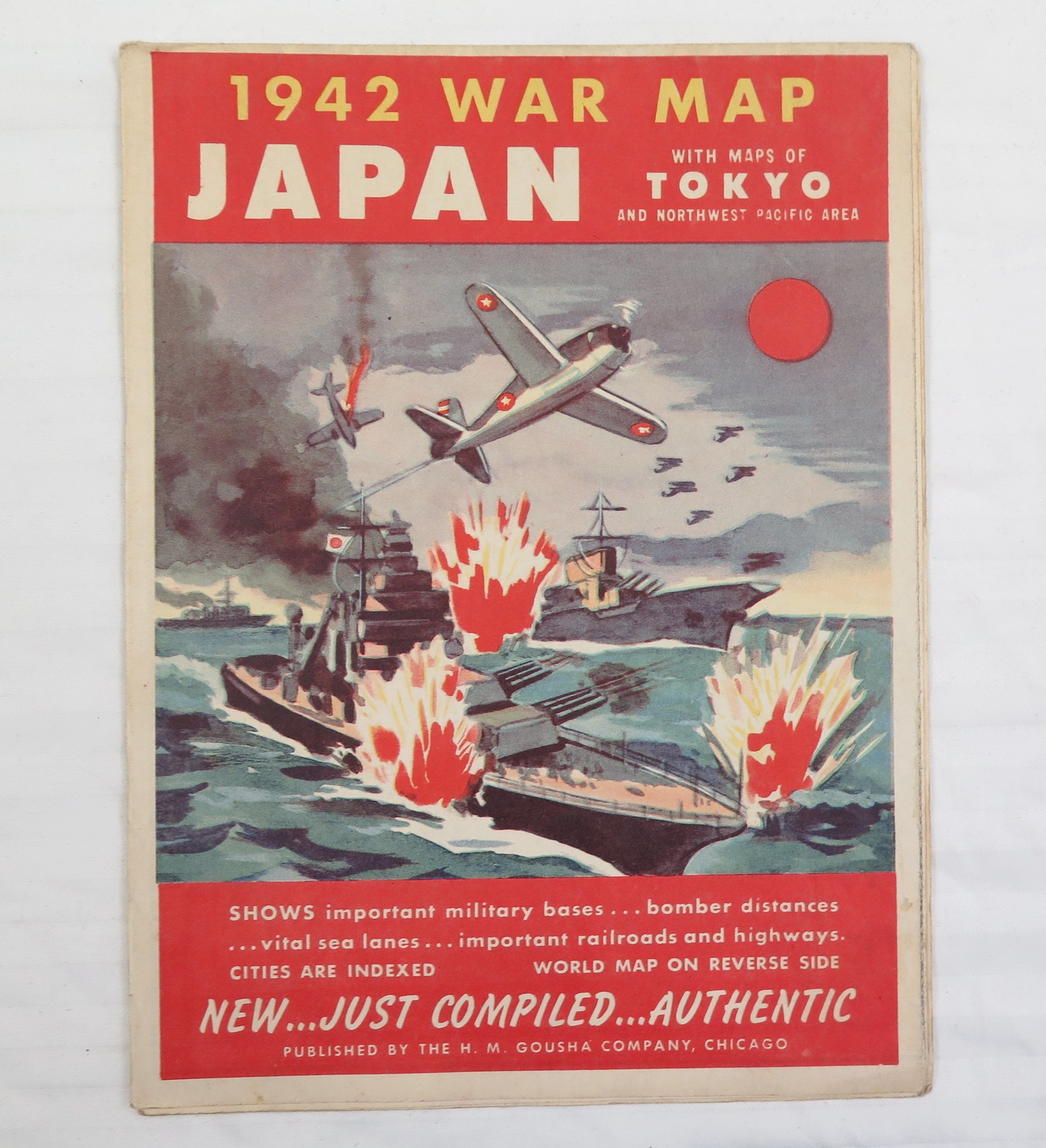 This is a WWII map of Japan. The map title is "1942 War Map/ Japan/ With Maps of Tokyo and Northwest Pacific Area". The red lines on the map are the "Air and steamer distances between objectives with flying and sailing time". The map was published by the H.M. Gousha Company in Chicago. The map measures 20" (w) x 27" (l).