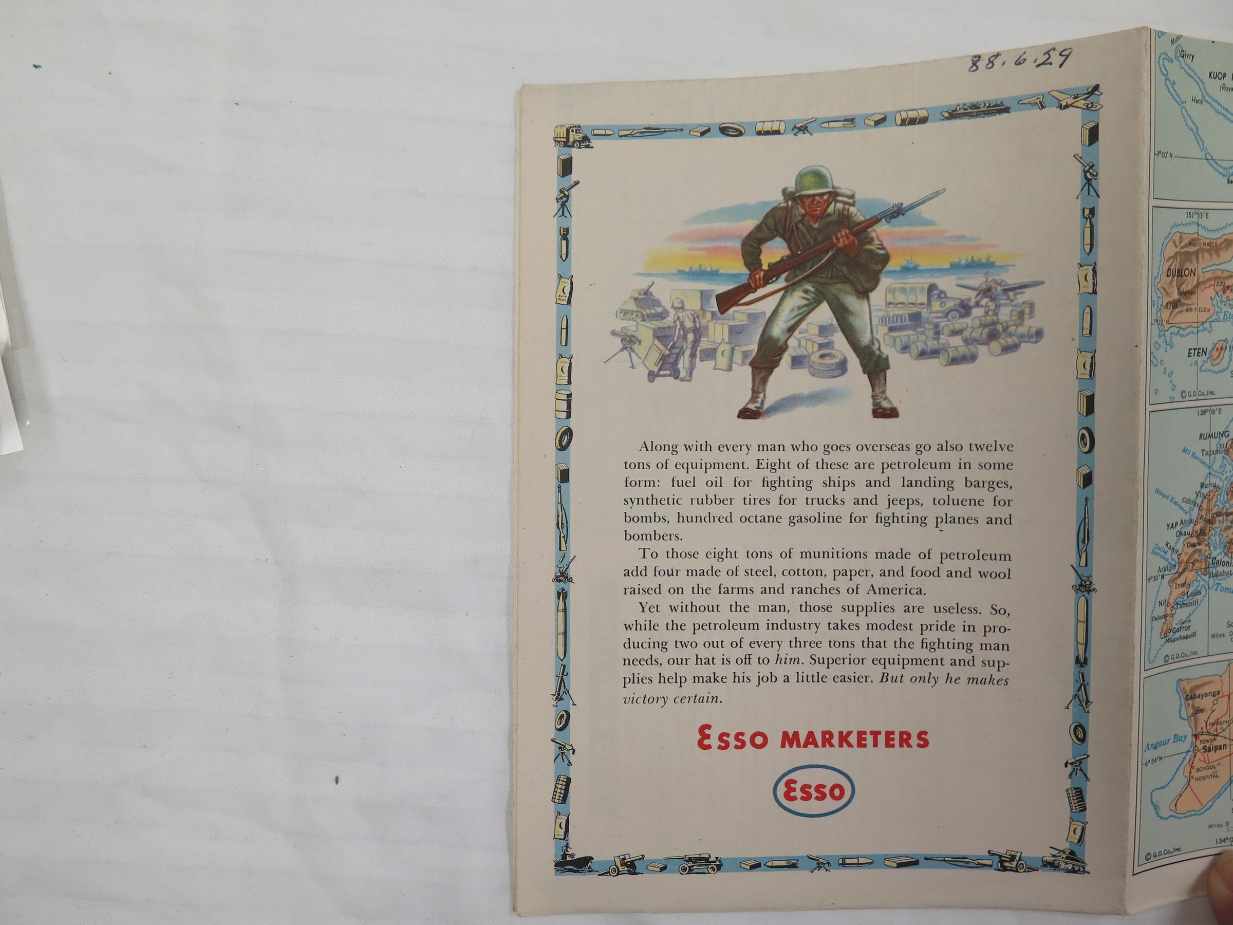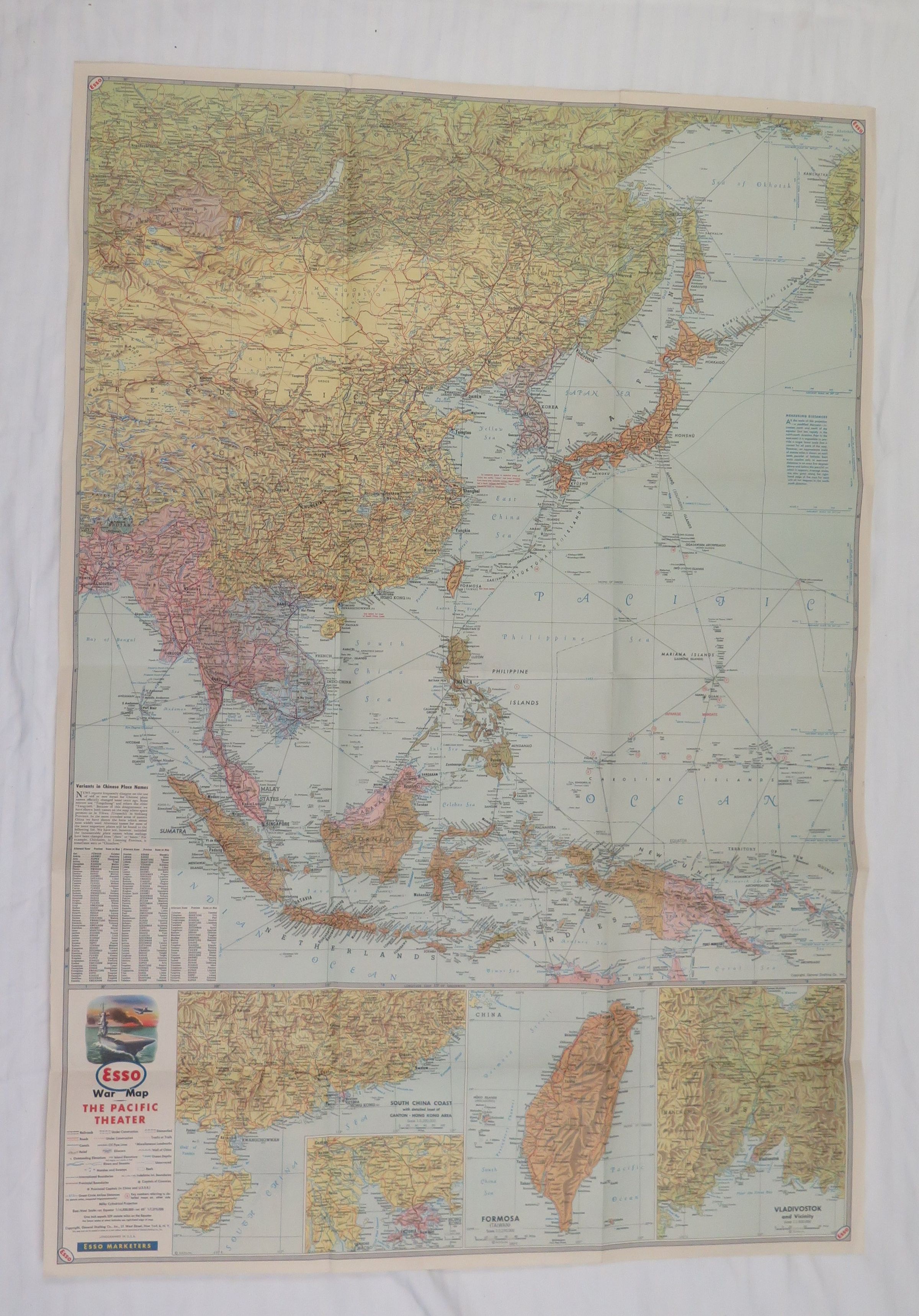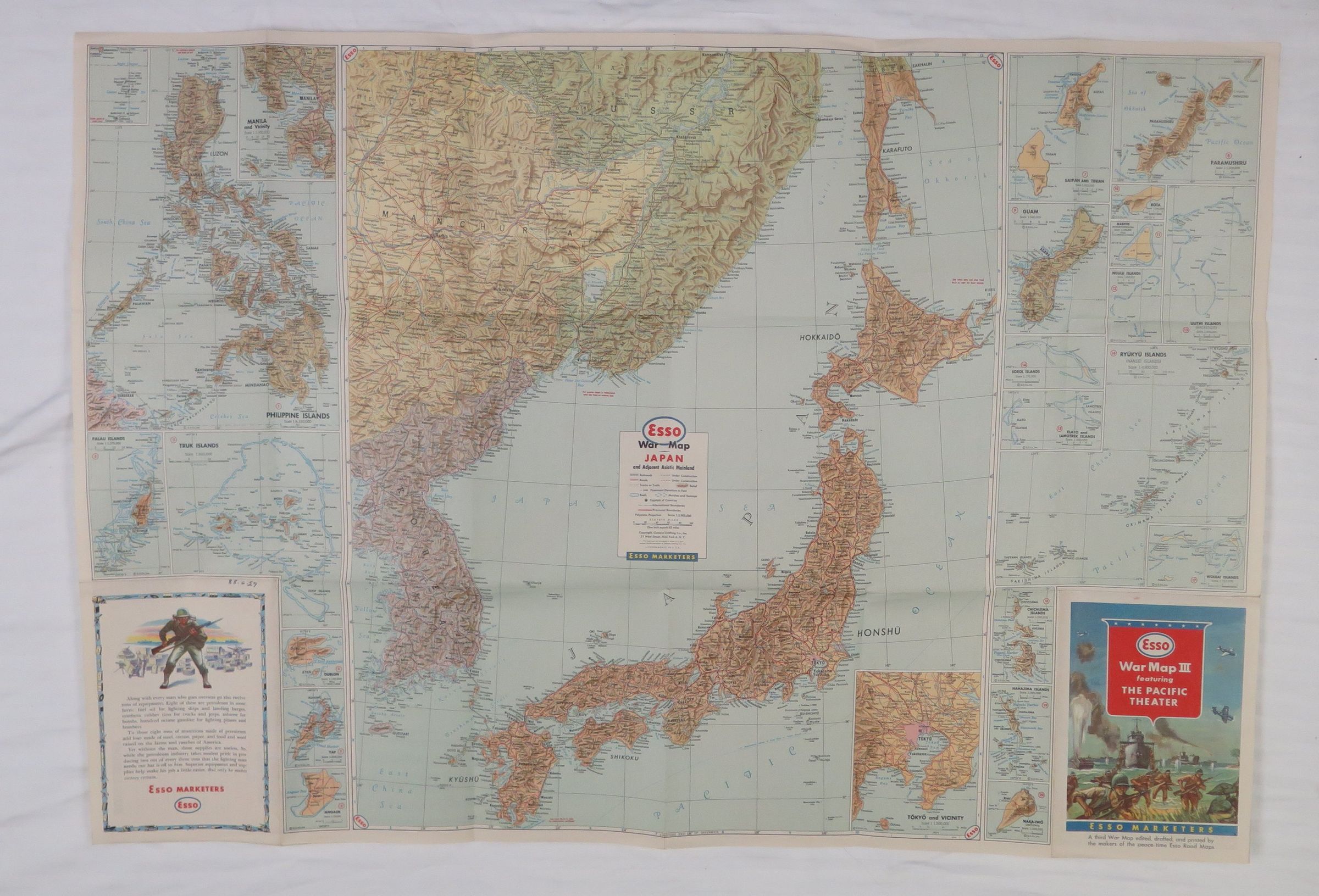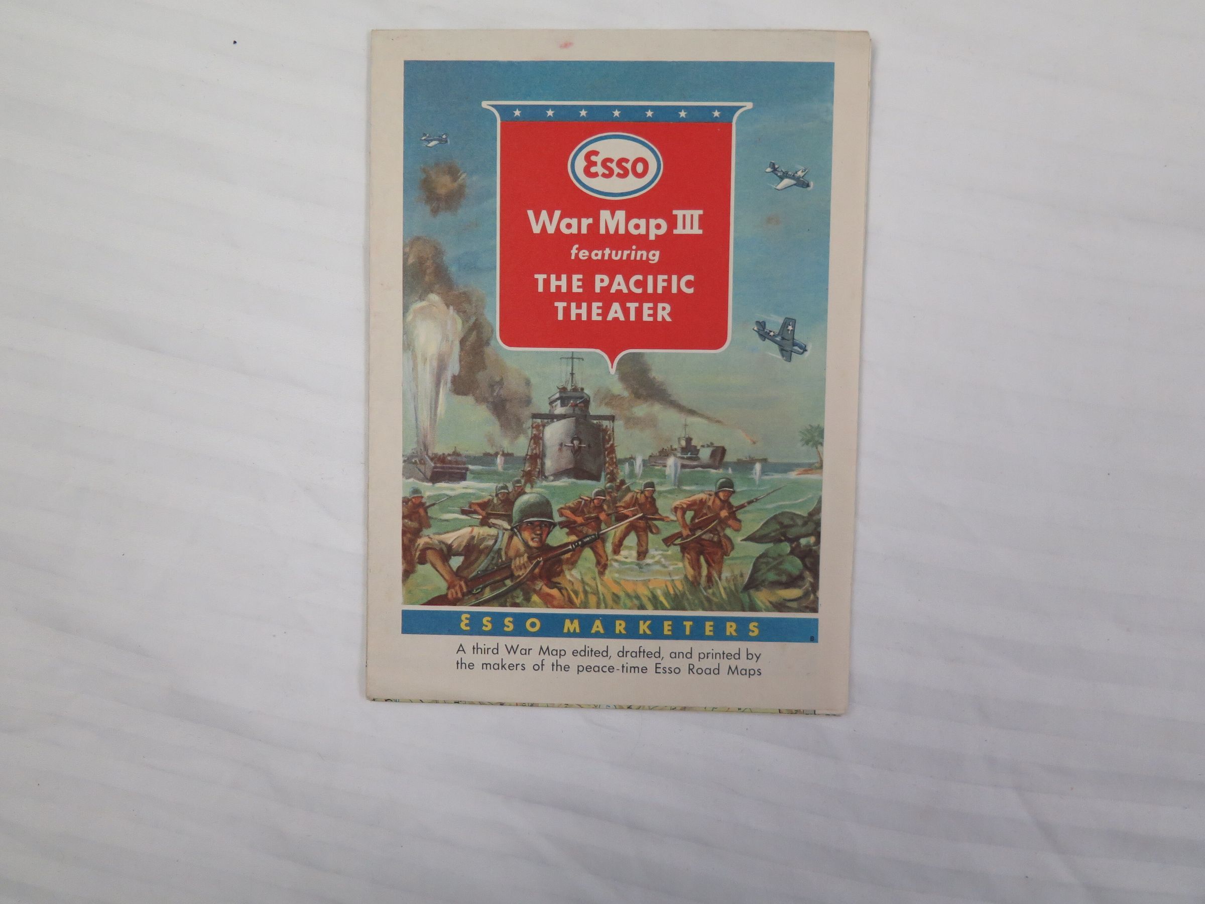 This is a map of the Pacific Theater of WWII produced by the ESSO company. ESSO made driving road maps before the war. The text on the front of the map reads, "War Map III/ featuring/ The Pacific/ Theater/ Esso Marketers/ A third War Map edited, drafted, and printed by/ the makers of the peace-time Esso Road Maps". The map measures 32.5" (w) x 22.5" (l).Collection
