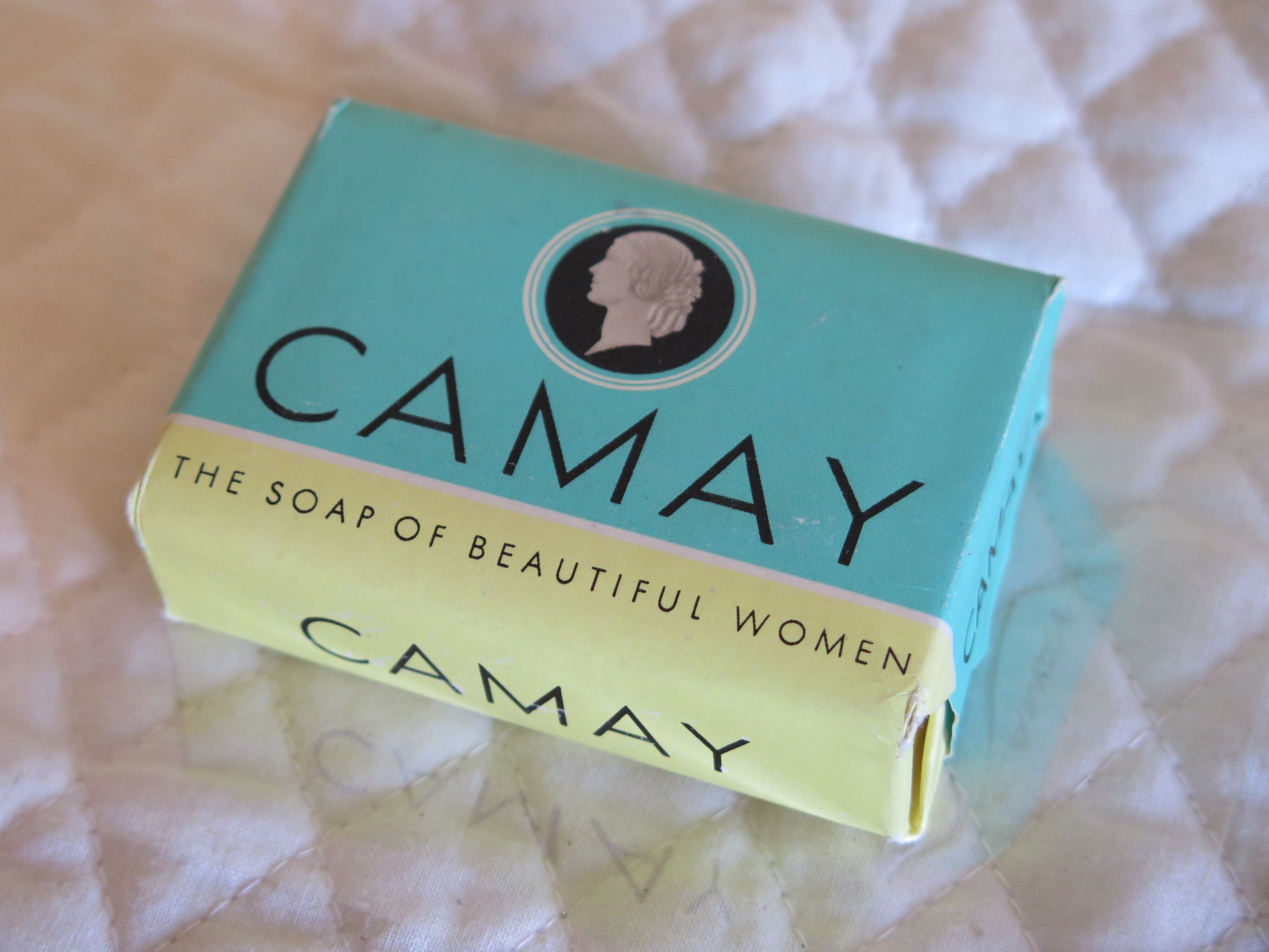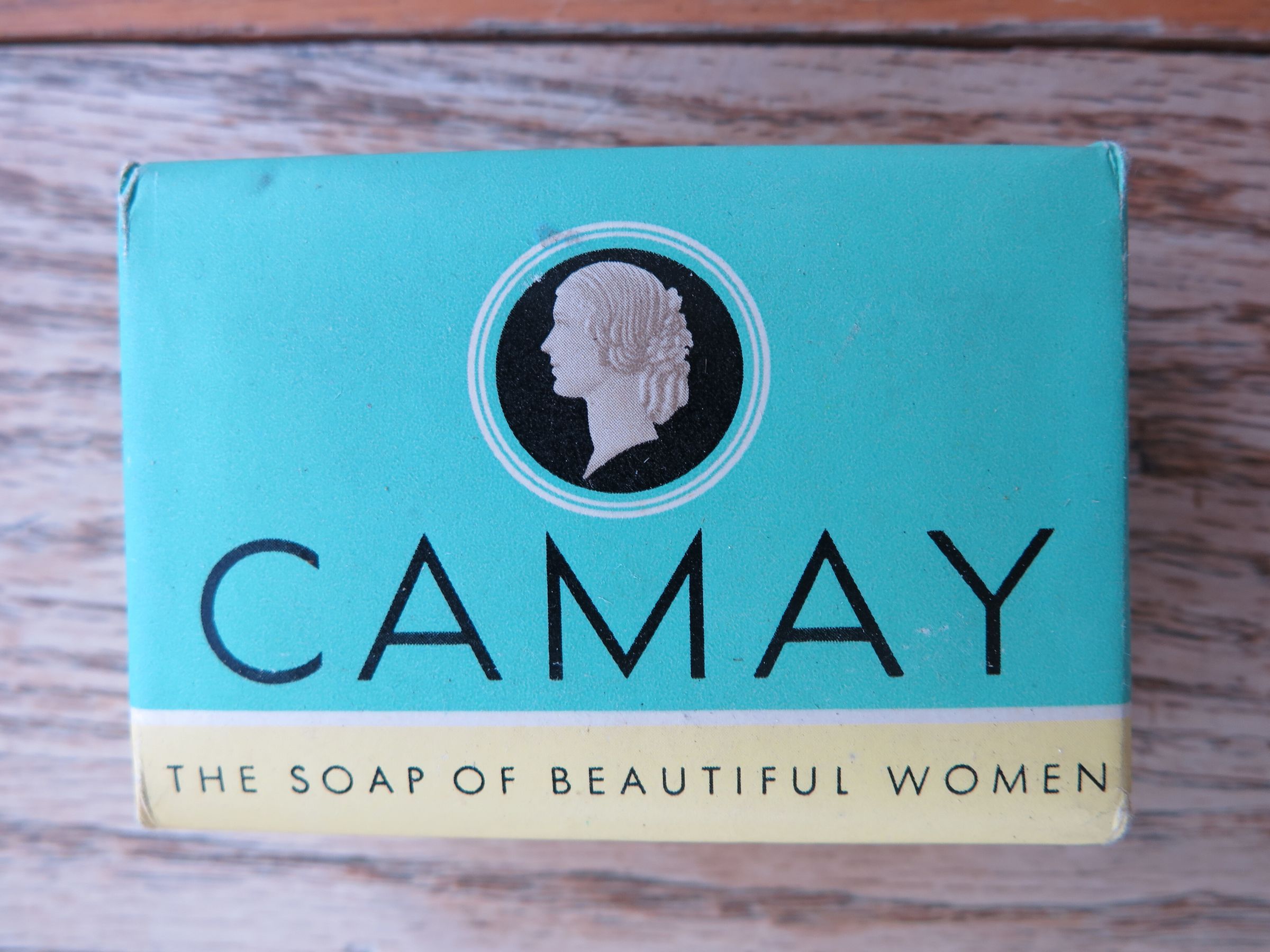 Small bar of Camay brand soap. The Wrapper is green with a yellow stripe at the bottom and an illustration of a woman's face in profile in white. The soap measures 1" (w) x 3.25" (l) x 2.25" (deep).Collection