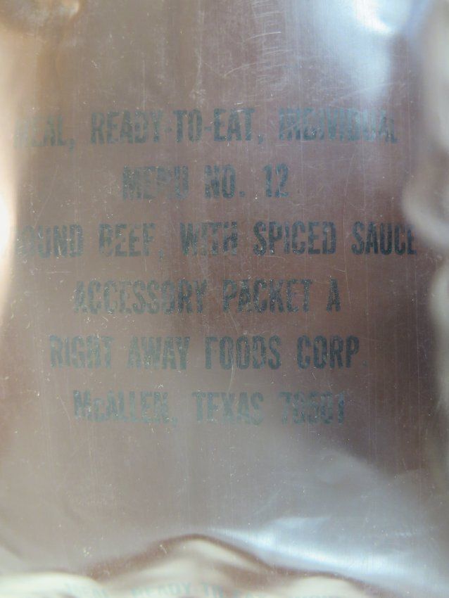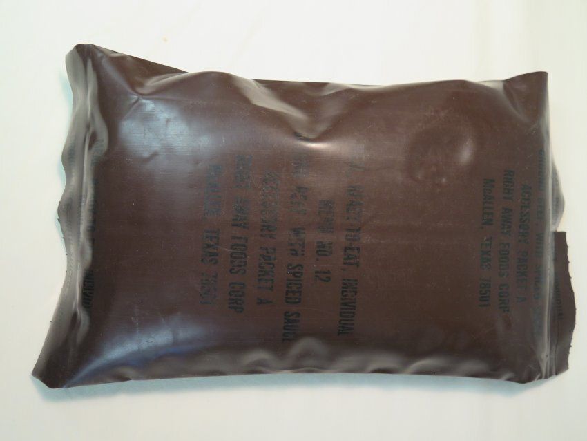 This is a brown plastic MRE bag sealed at both ends. It holds food items given as rations to military personel for consumption in the field. This ration is ground beef with spiced sauce. It is possible that the bag with swell to bursting, so it is important to keep an eye on it. The bag measures 2" (h) x 7" (w) x 12.5" (l).