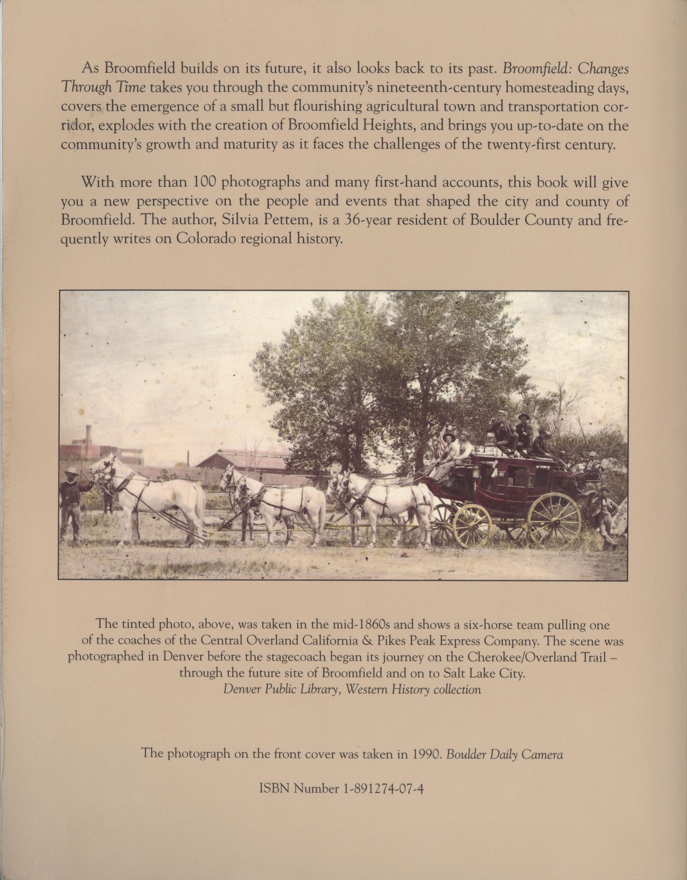 This is a history of Broomfield, Colorado, commissioned by the City and County of Broomfield. The book begins with nineteenth-century homesteading, and covers the emergence of a small agricultural town and transportation corridor, the post-World War II development of Broomfield Heights, and the creation of the City and County of Broomfield in 2001. The book has an index and appendices. Appendices include "Public Schools Attended by Most Broomfield Students in 2001," "Elected Officials," and "Referendum C: City and County of Broomfield." This is a 11" (L) x 8 1/2" (W) paperback book with 242 pages. The cover is a color landscpae photograph of a meadow with the Rocky Mountains in the background. The title is printed in black on the cover.