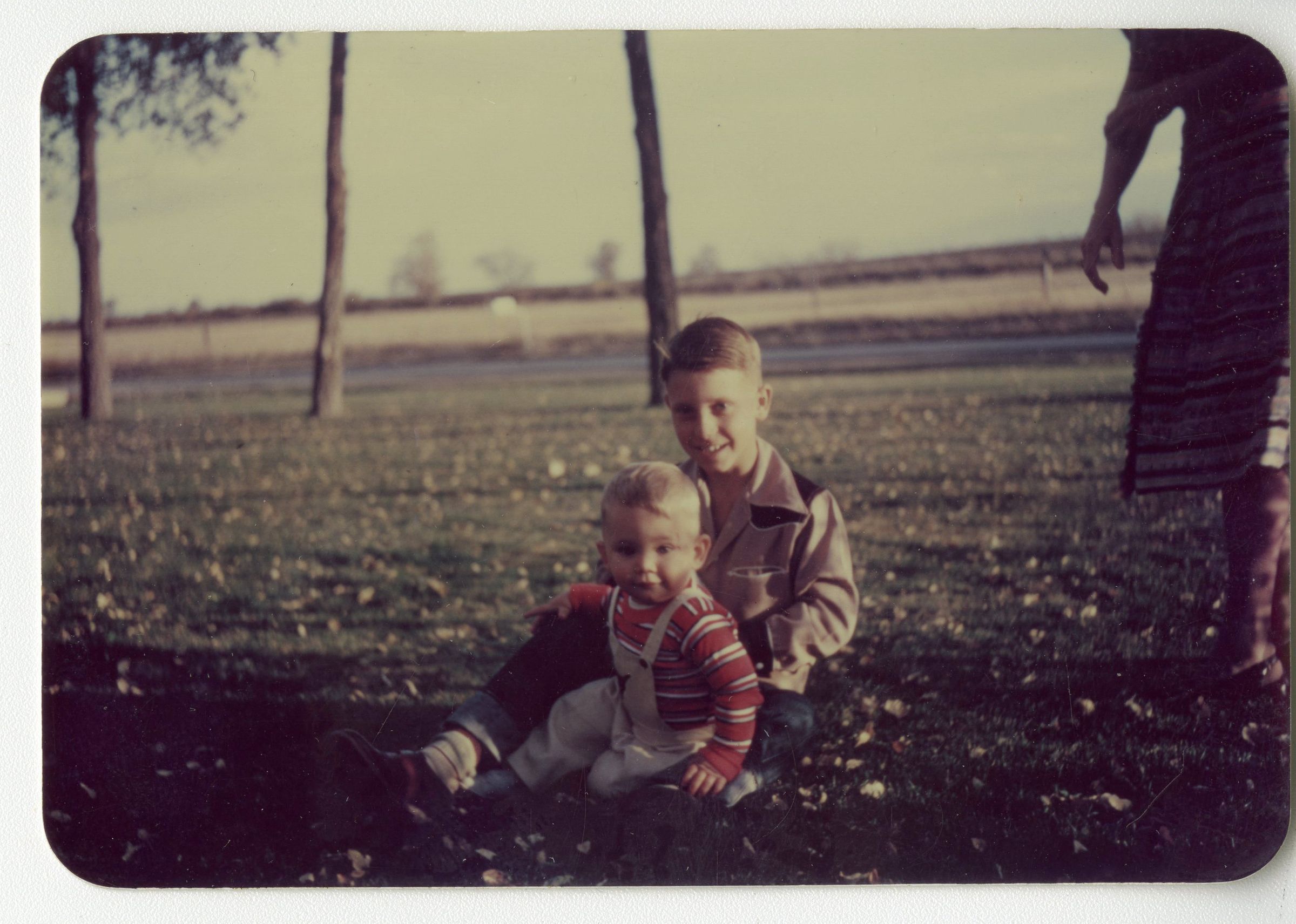 Color photograph of two boys. The older of the two is Lester K Brunner. The other boy is unidentified, but is possibly one of Clyde's children. There is an unidentified woman on the right side of the image. Photograph was taken outside, likely at the Brunner Farm.Photograph Details