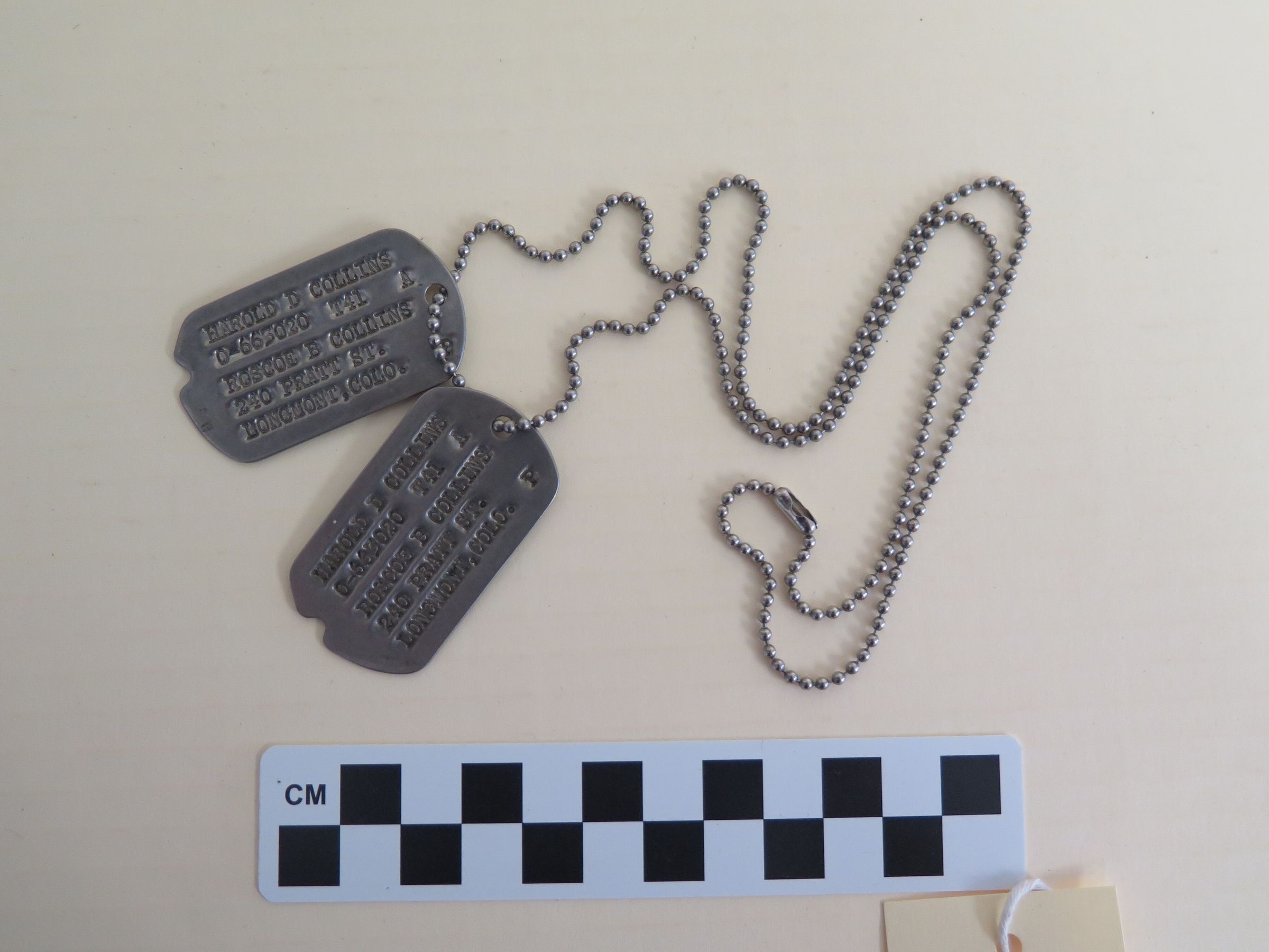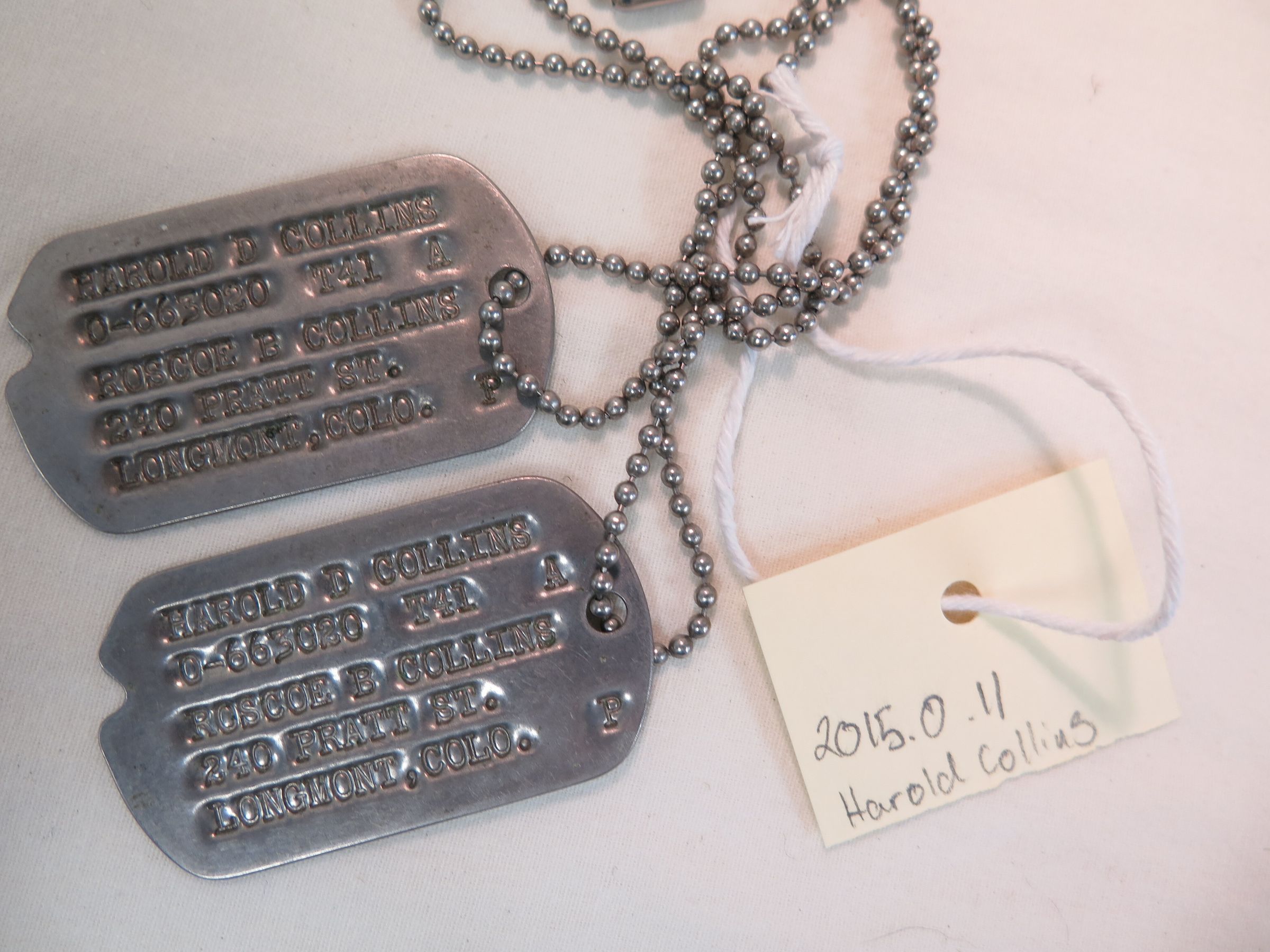 This is two dog tags for Harold Collins who served in World War II (WWII). The tags are stamped aluminum and attached by a ball chain. The notification name was: Roscoe Collins, 240 Pratt Street, Longmont, Colo. The tags measure 1.25" (w) x 2" (l).Collection