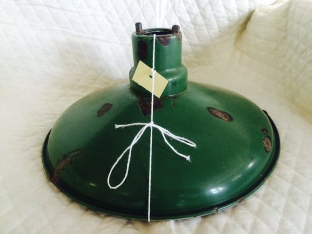 This is a metal lampshade that has been painted green. The paint is starting to chip off of the metal. The lampshade measures 6" (h) x 13" (dia).