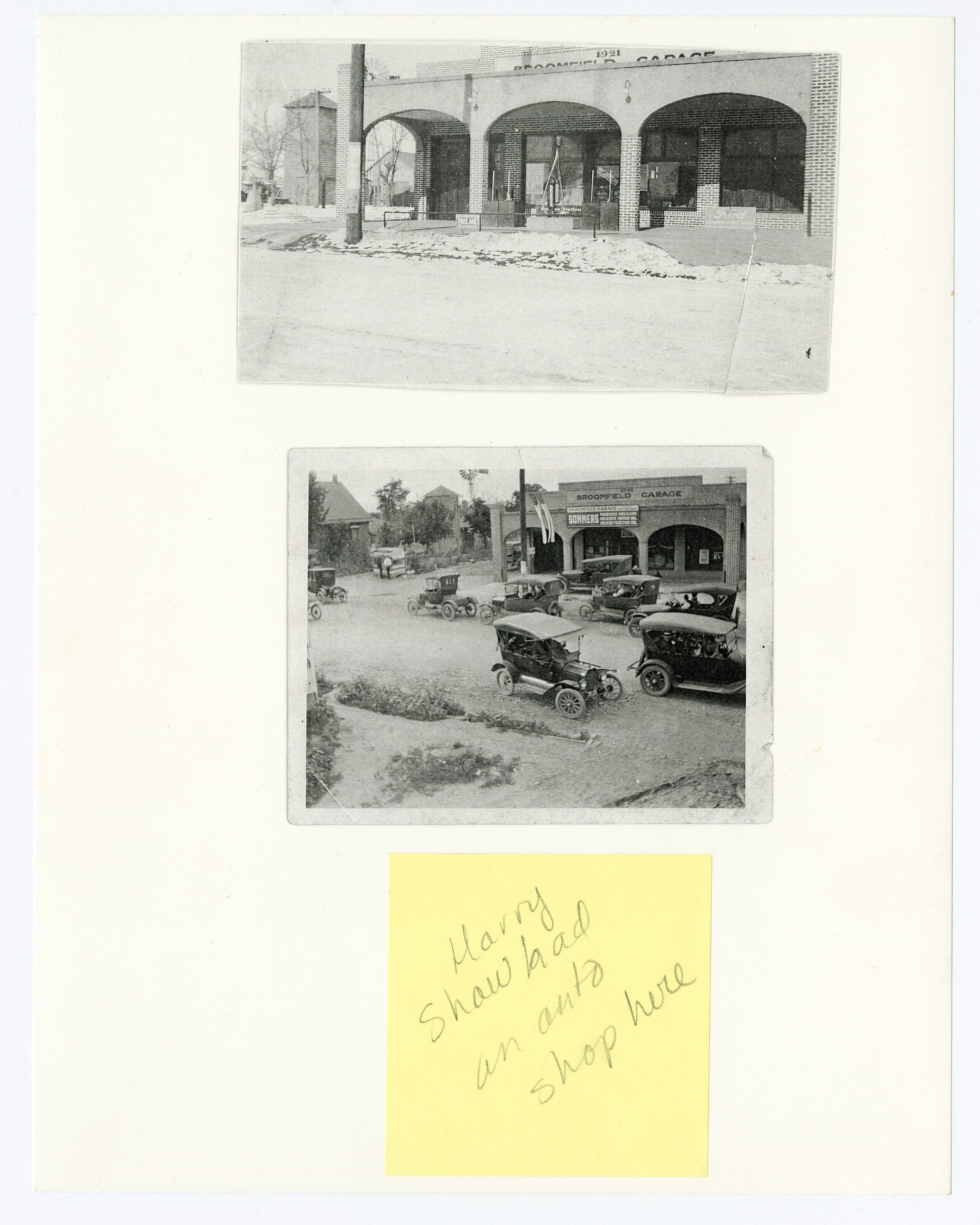 These are black and white photos of the Broomfield Garage from the street. The second one shows automobiles in front of it. It is owned by Harry Shaw, who is the brother of Elizabeth Brunner.
