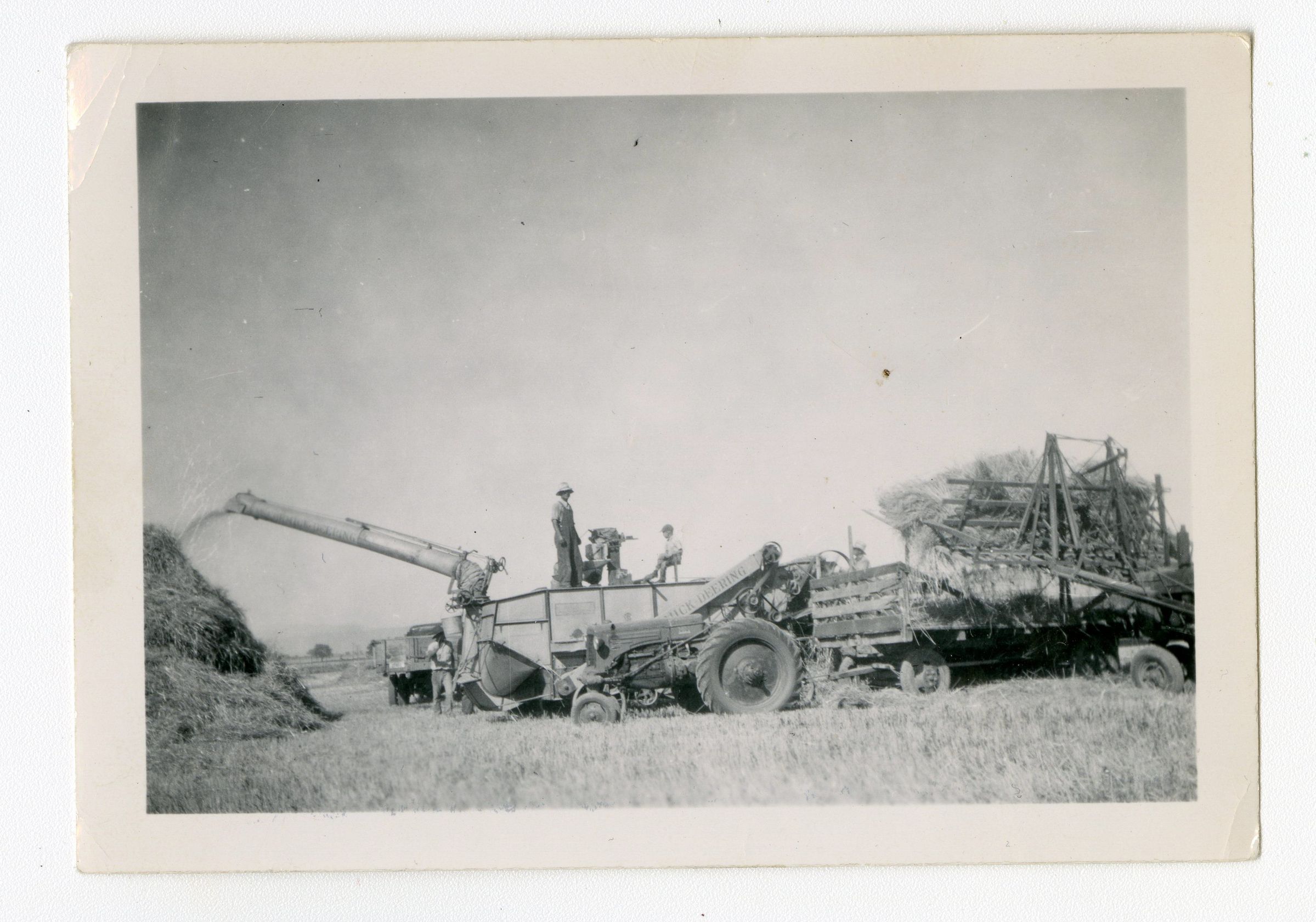 Black and white photograph of Lester C Brunner's trash machine. He owned the only one in Broomfield and would do thrashing for other families. Lester C is on top of the machine. Lester K is sitting. Probably located at Brunner Farm.