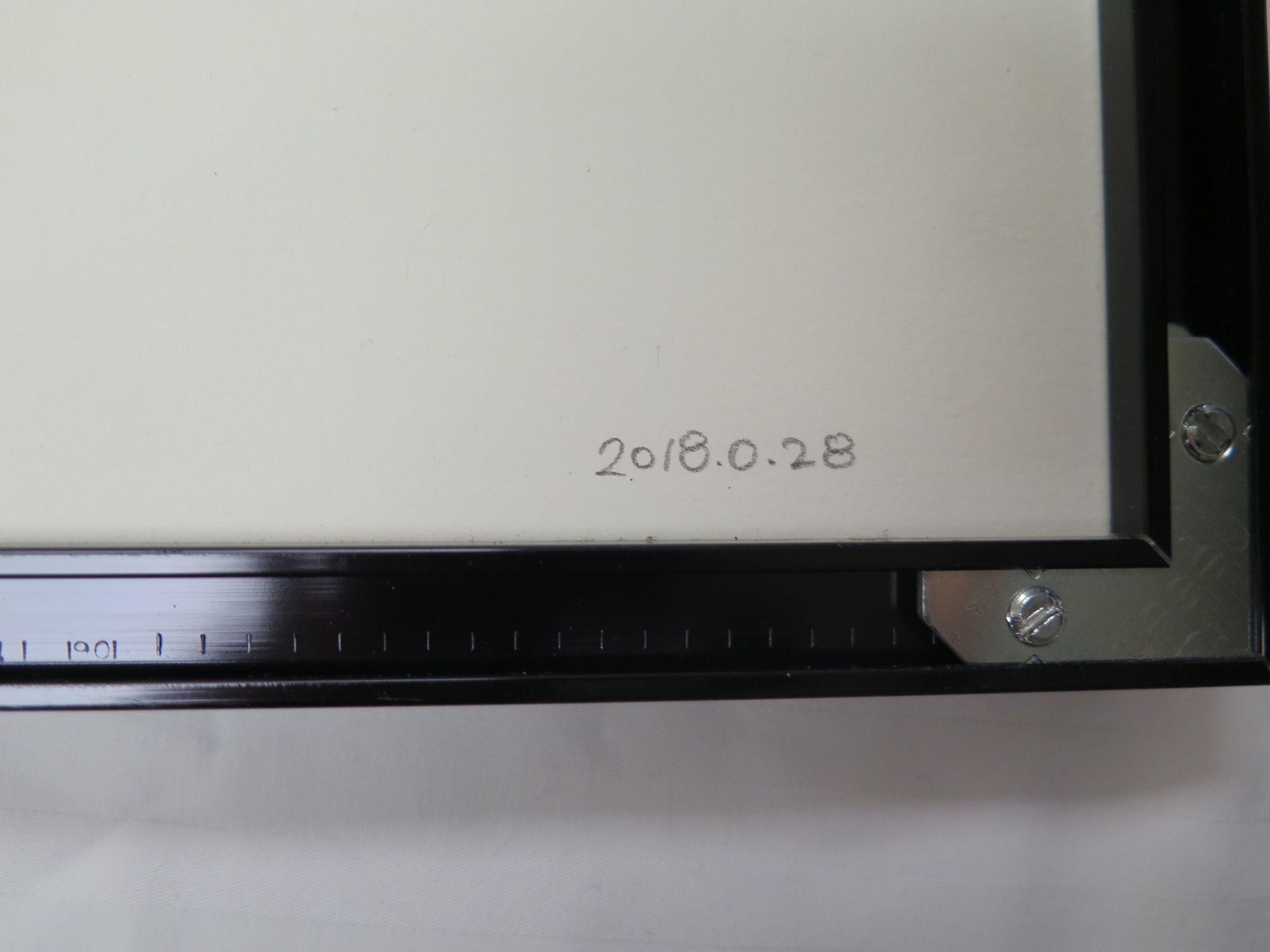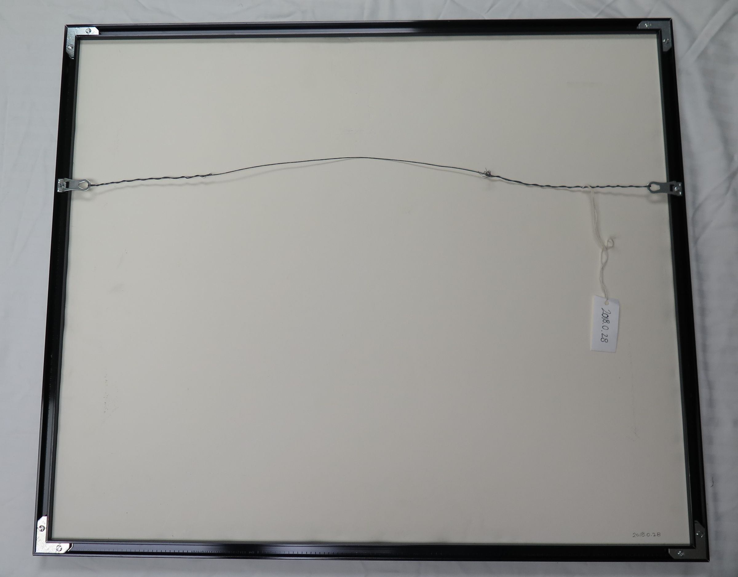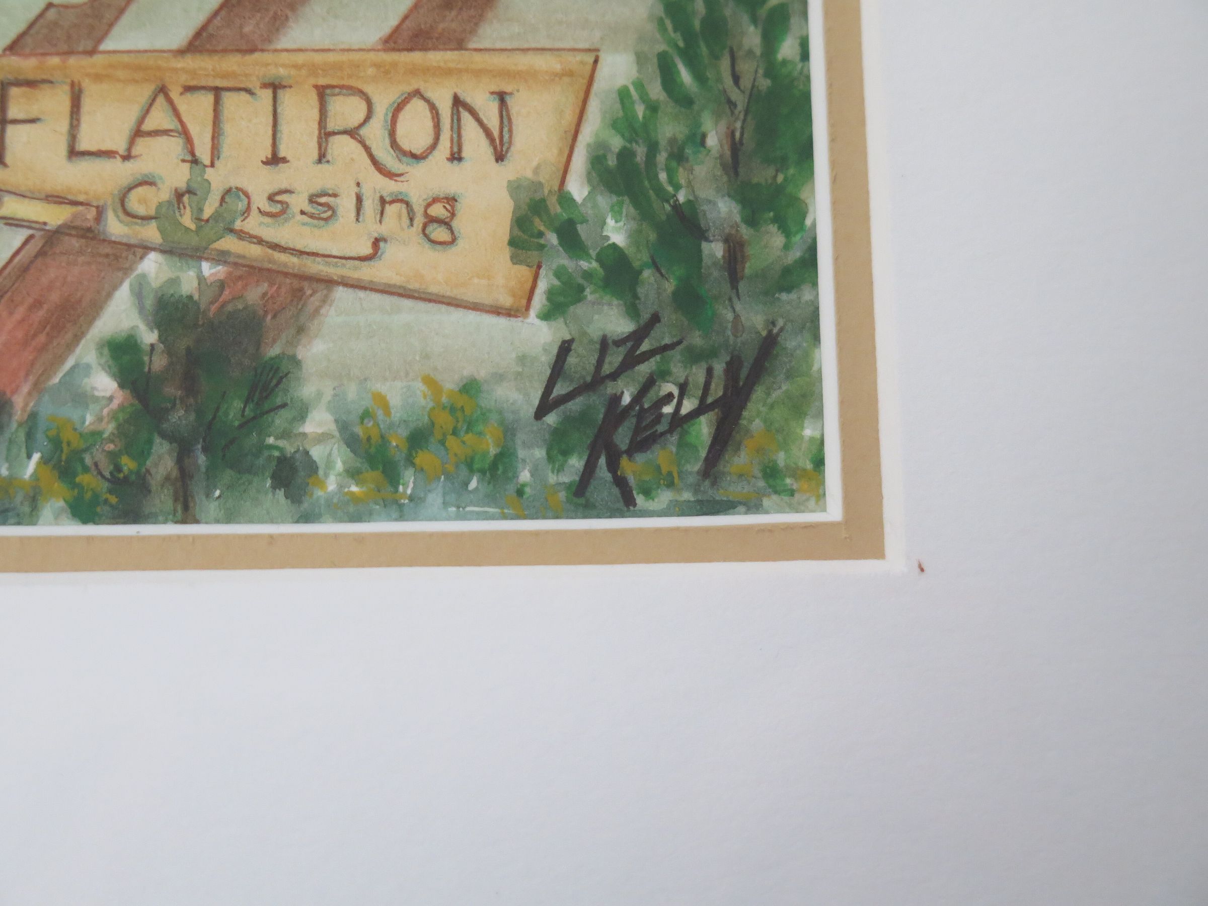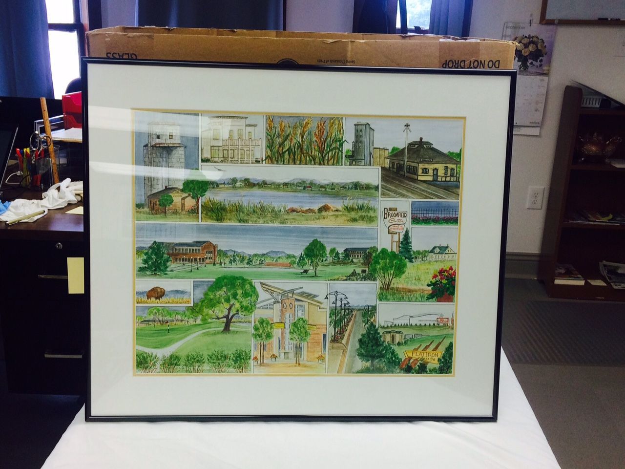 Black plastic frame with a water color and pencil artwork depicting Broomfield landmarks inside. Depictions include, a buffalo, Flatiron Crossings Mall, Jones Hall, the Grain Elevator, The Depot, Eagle Trace Golf Course, Josh's Pond, the Mamie Doud Eisenhower Public Library, the Paul Derda Recreation Center, the Brunner House, and Broom Corn. The frame measures 26" (h) x 22" (w) x 1" (deep).Collection