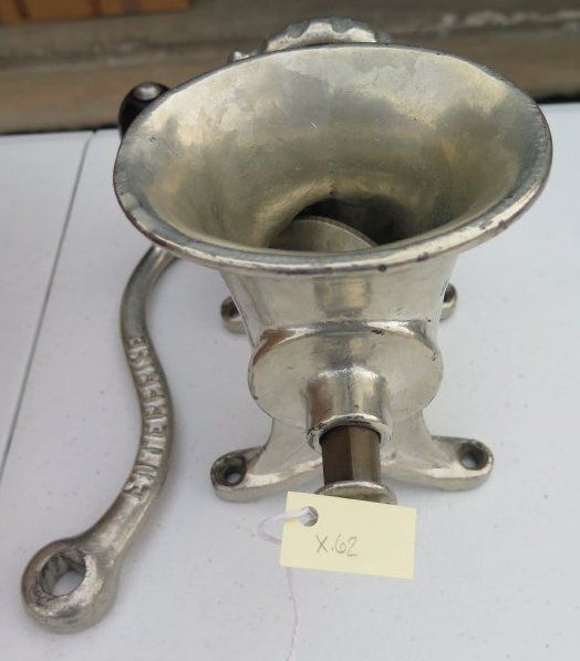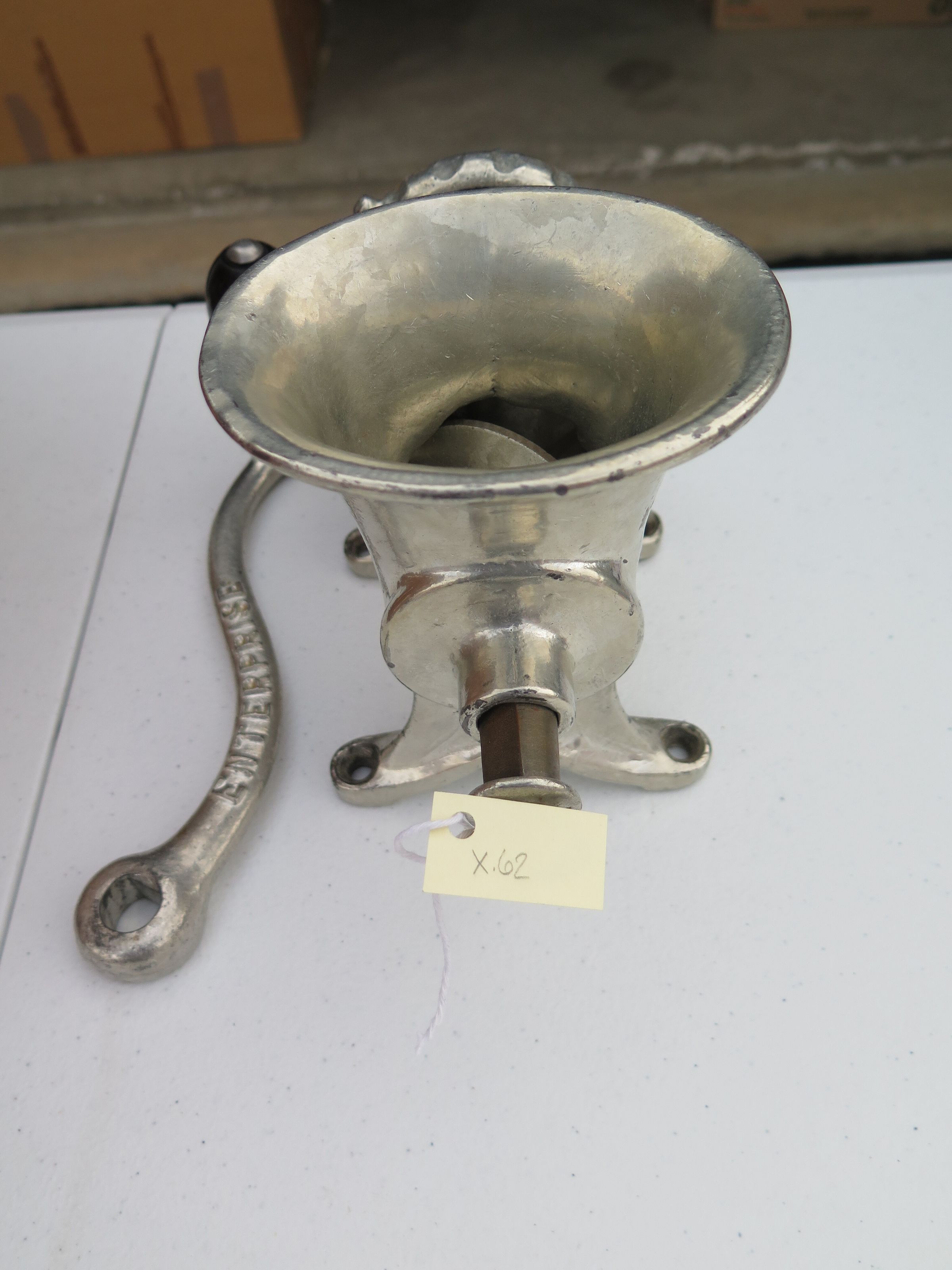 This is a metal meat grinder. The text on the meat grinder reads, "Enterprise" and "No. 112". The meat grinder measures 7" (h) x 9" (w) x 5" (d).