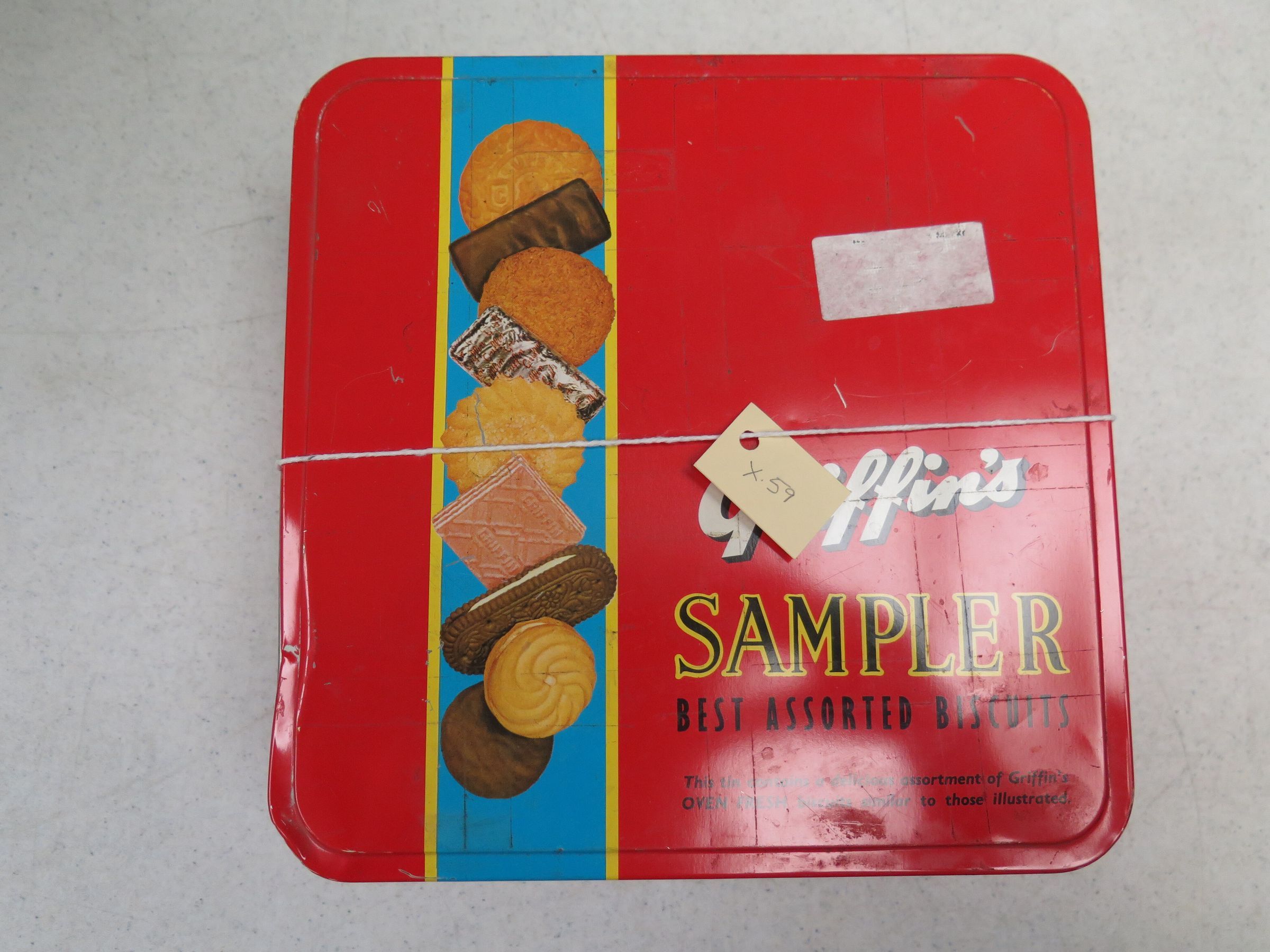 This is a red metal tin with a lid. The tin originally held biscuits as a "Griffins Sampler". The tin measures 4.5" (h) x 9" (w) x 9" (l).