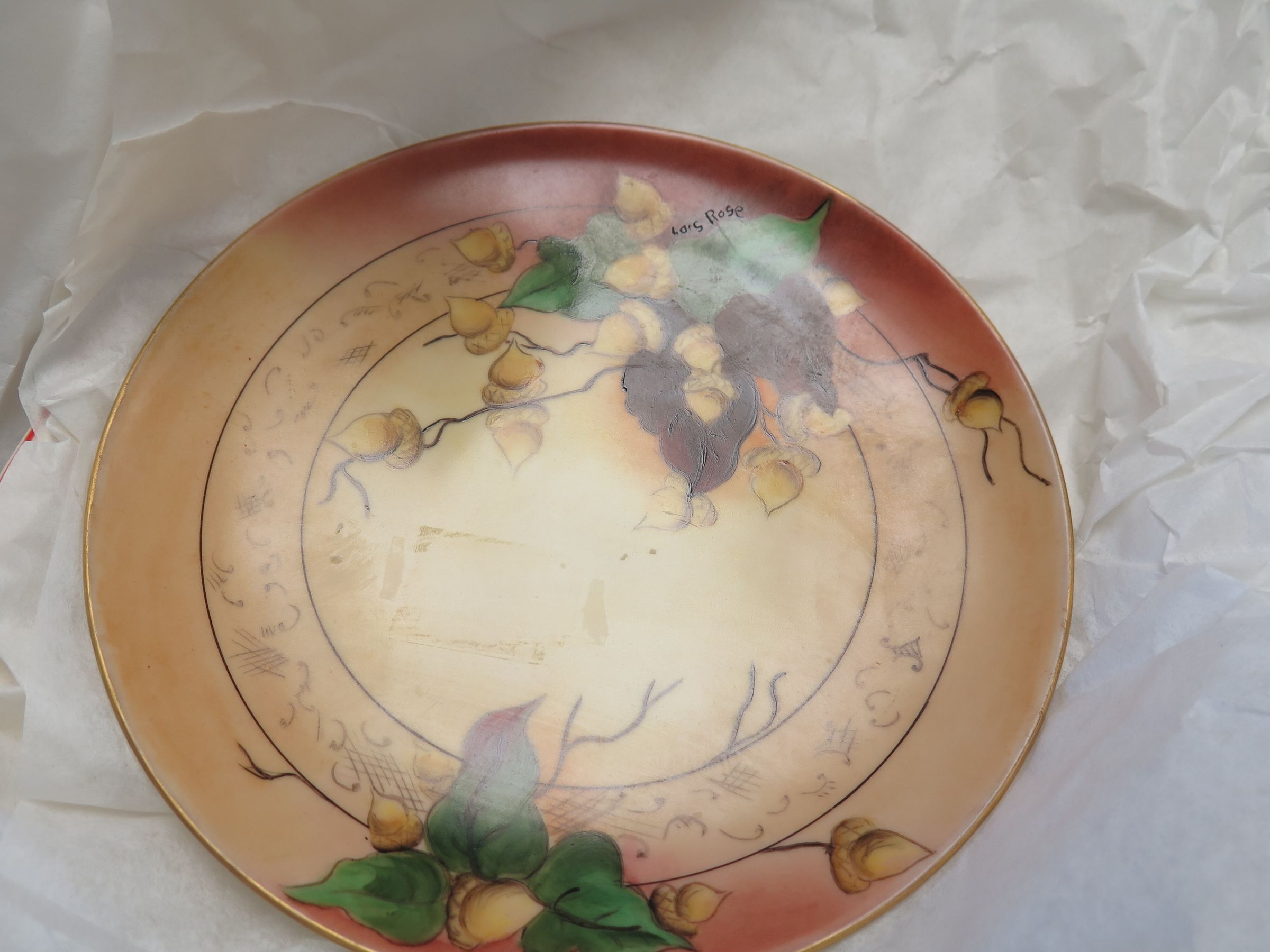 This is a 7" (dia) decorative plate made by Lois Rose. The top of the plate has oak trees painted on it with acorns growing on them.