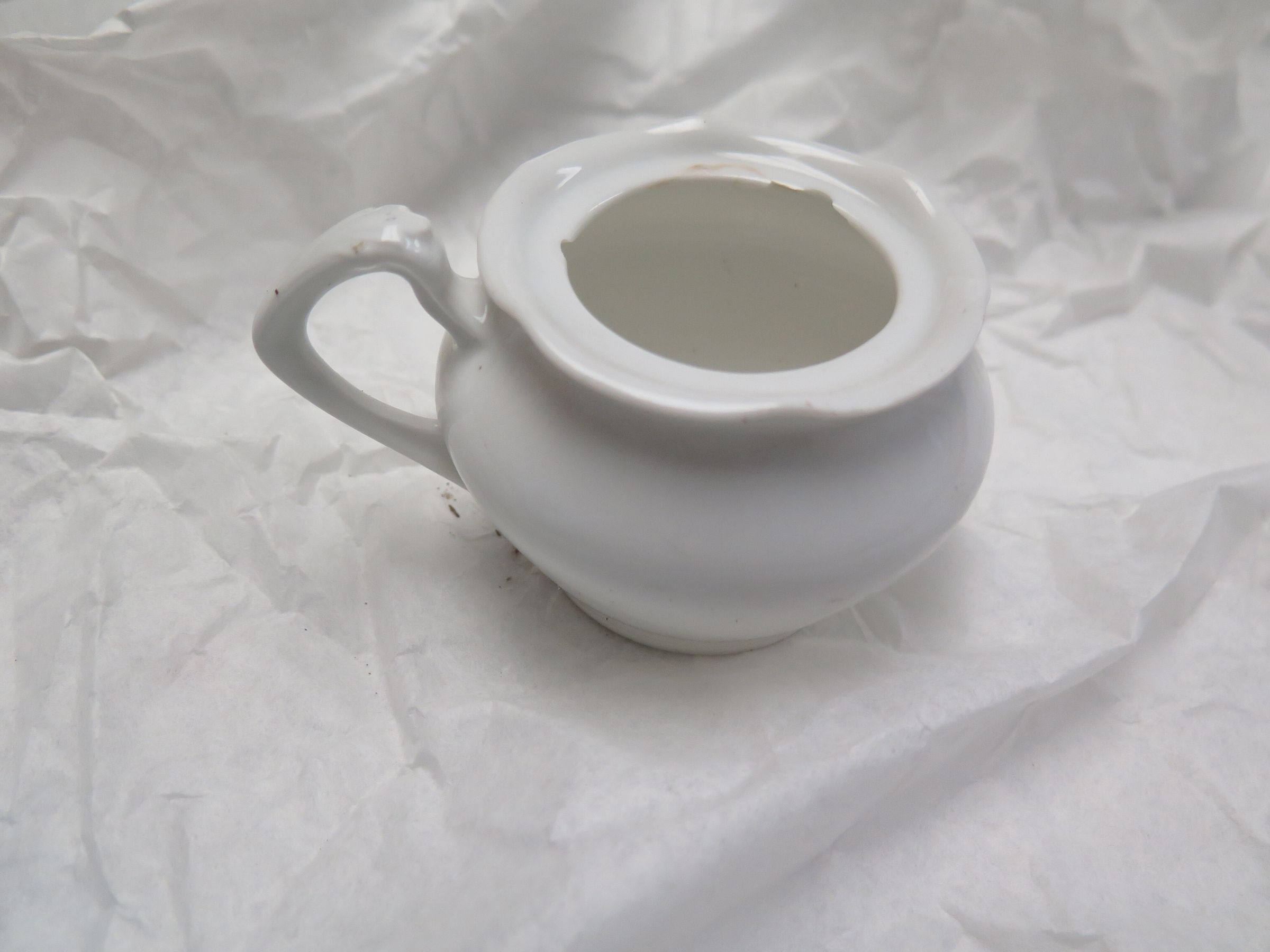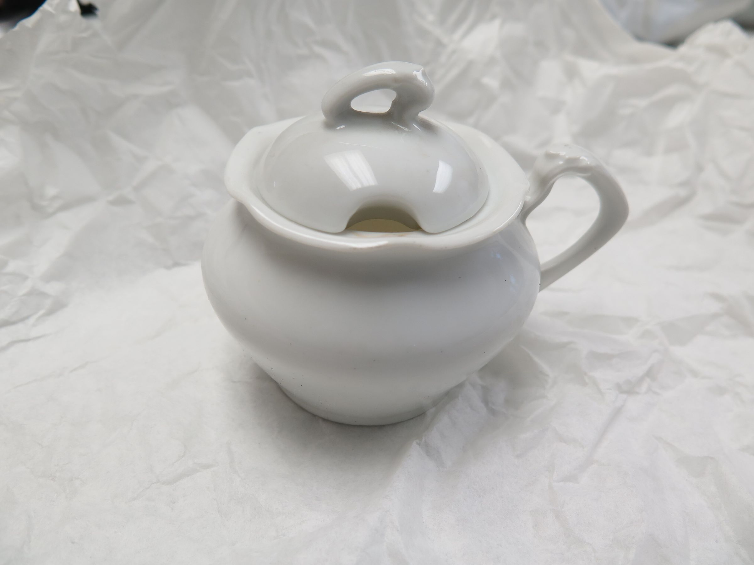 This is a white sugar bowl with a lid. The bowl has a handle on one side. The lid has a hole in the top where a spoon can stick out. The sugar bowl measures 3.25" (h) x 4" (w).