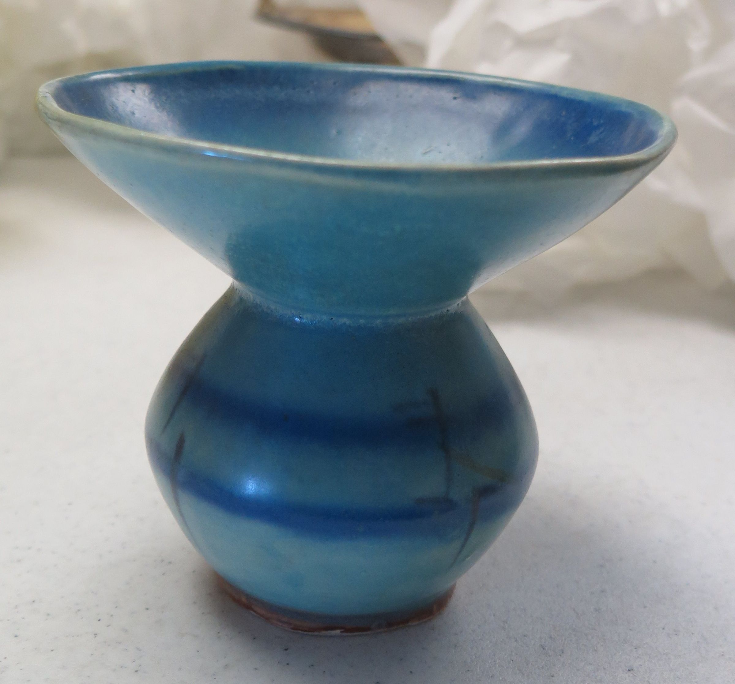 This is a blue ceramic vase. The vase has a narrow base with a much larger lip around the opening on the top.The vase measures 4" (h) x 4.5" (dia).