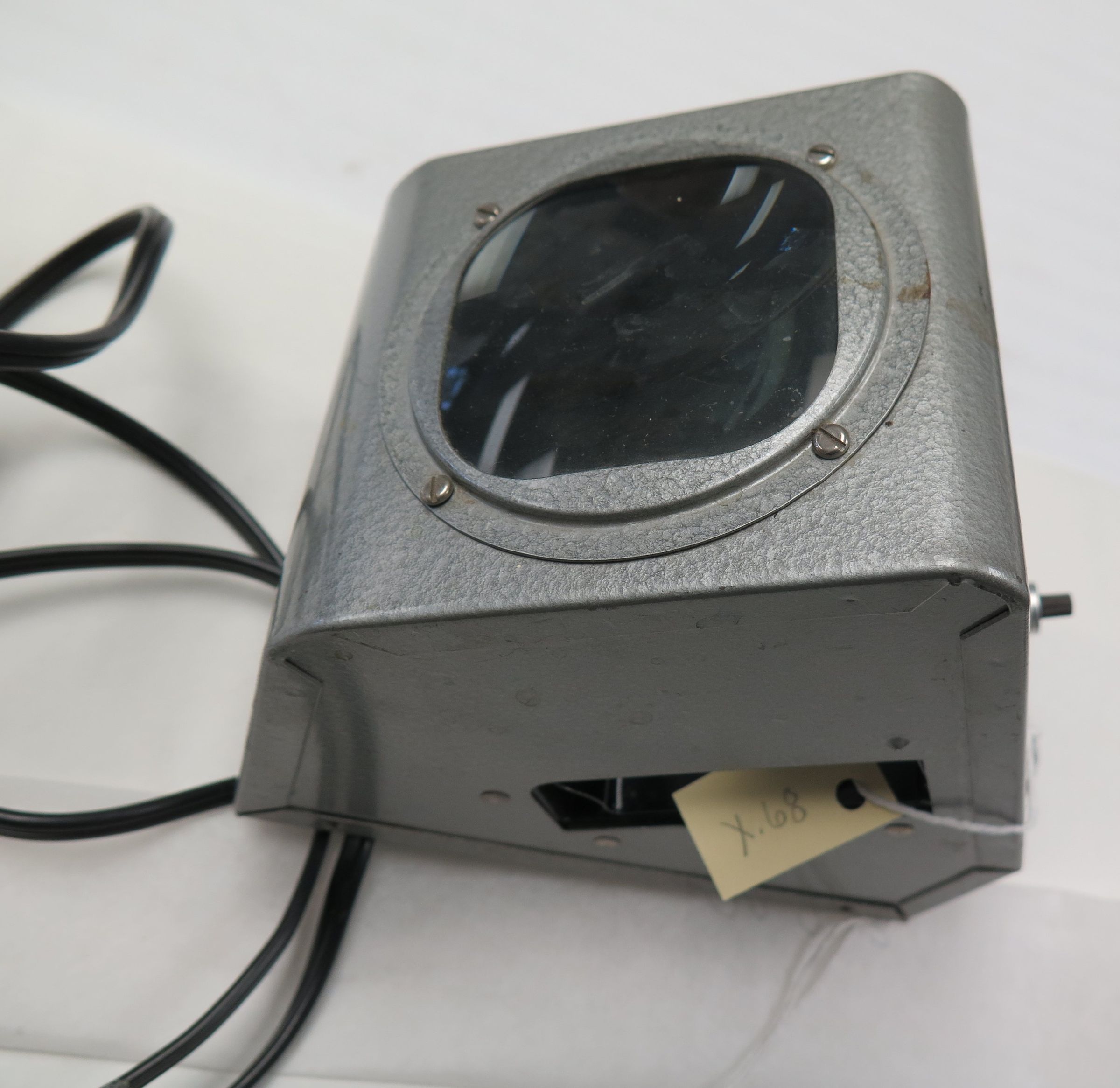 This is a silver-colored metal slide viewer. The slide viewer has a black cord coming out of the back of it. The cord has a 2 pronged plug at the end. The back of the slide viewer has the text "No. 210 Slide Viewer/ HO-120 V A.C. OR D.C. 60 C./ Max Lamp 7.5 watts/ Ogan Elec. Spec. Co./ Chicago, Ill." etched into it. The slide viewer measures 6" (h) x 4" (w) x 6" (d).