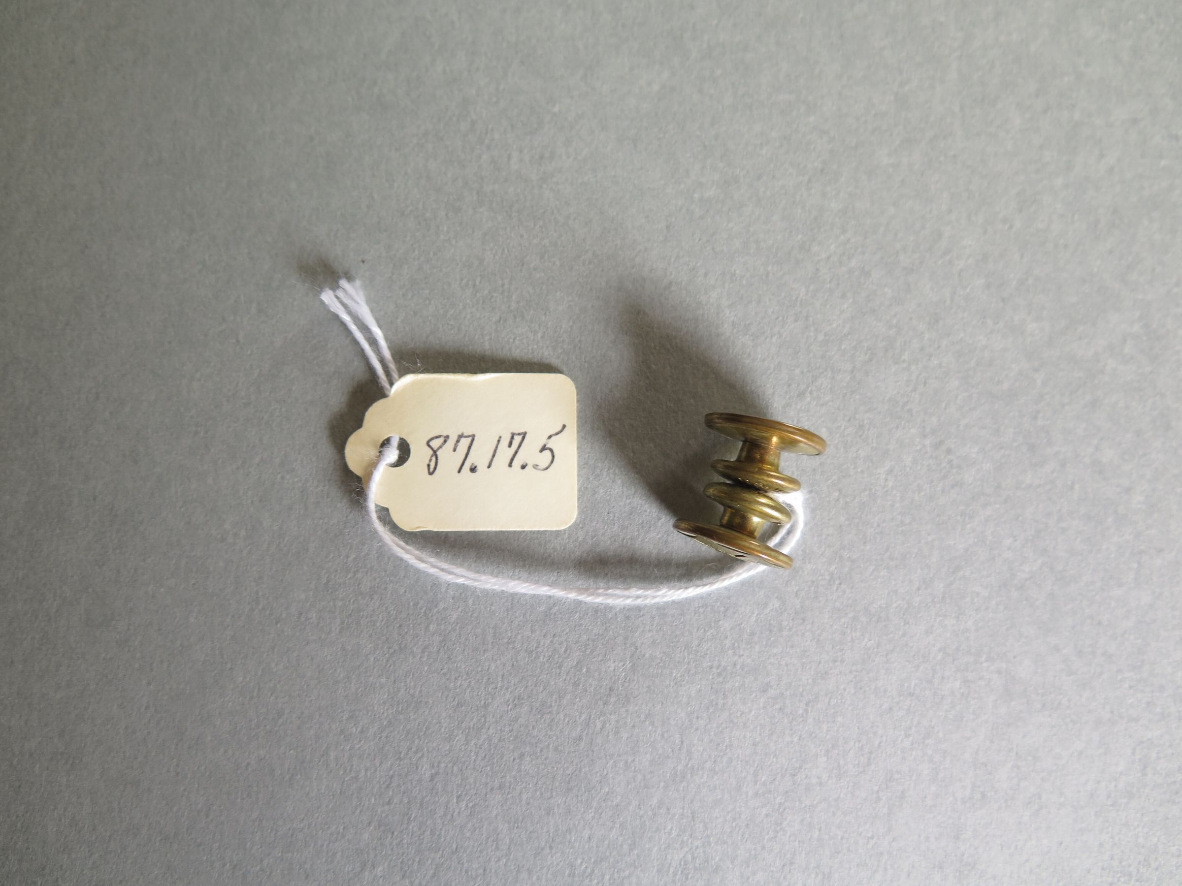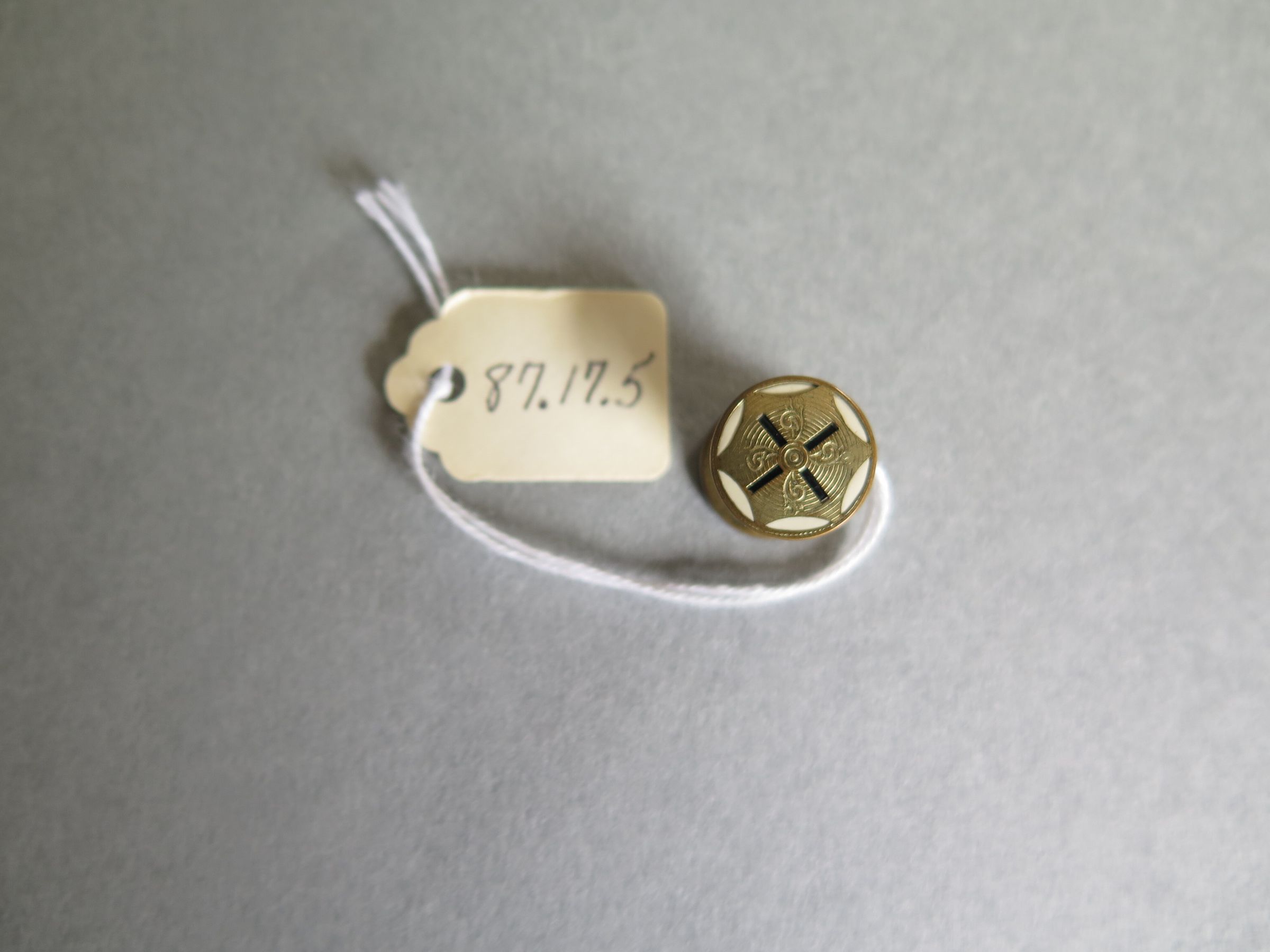 Gold cufflinks with black and white design. The cufflinks are currently on shirt 1987.18.3. The cufflinks measure 1.5" (l).