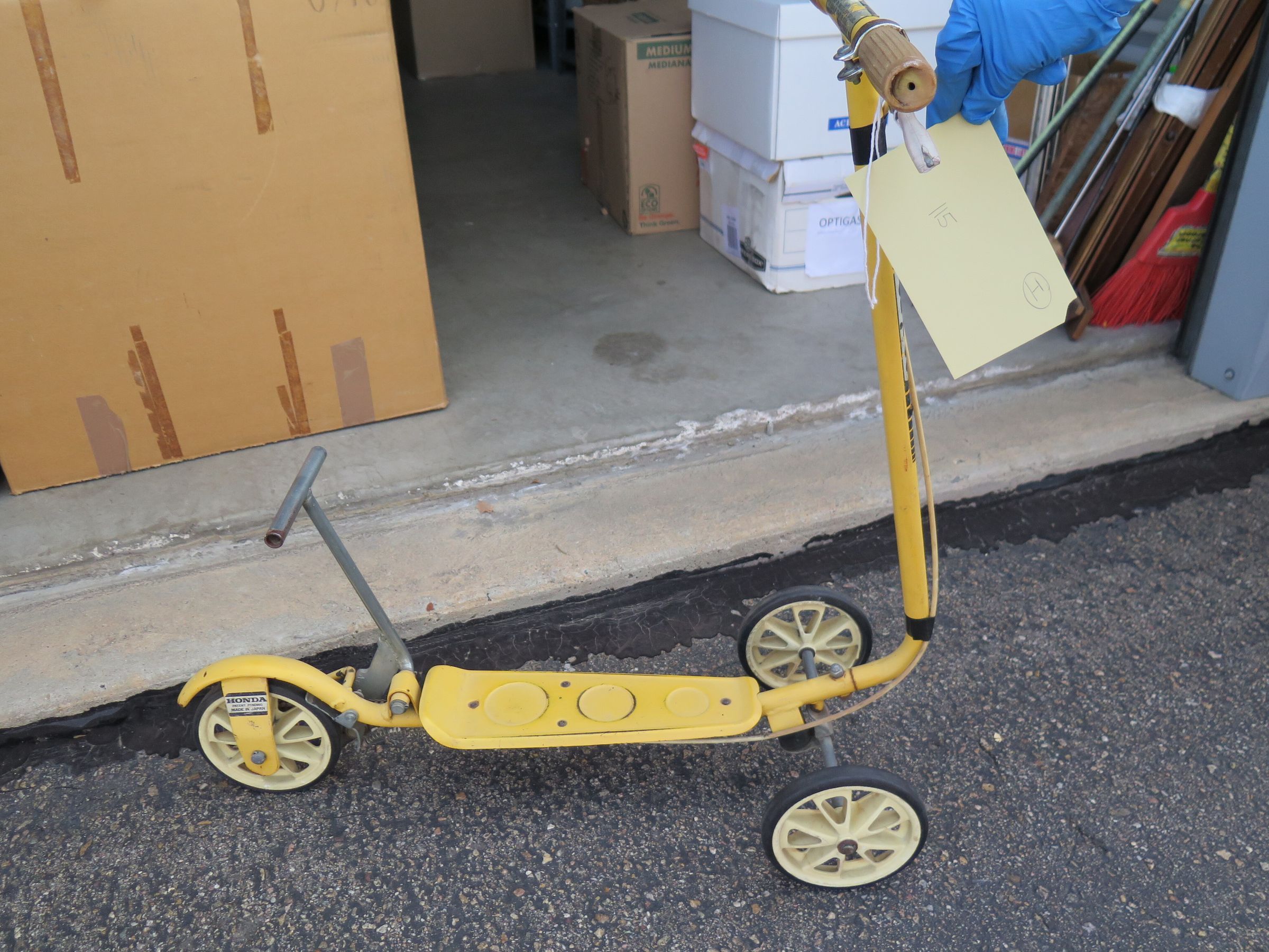 This is a yellow metal scooter with two wheels in the front and one in the back. The "Kick-N-Go" scooter, manufactured by Honda, measures 31" (h) x 29"(l) x 11"(w).