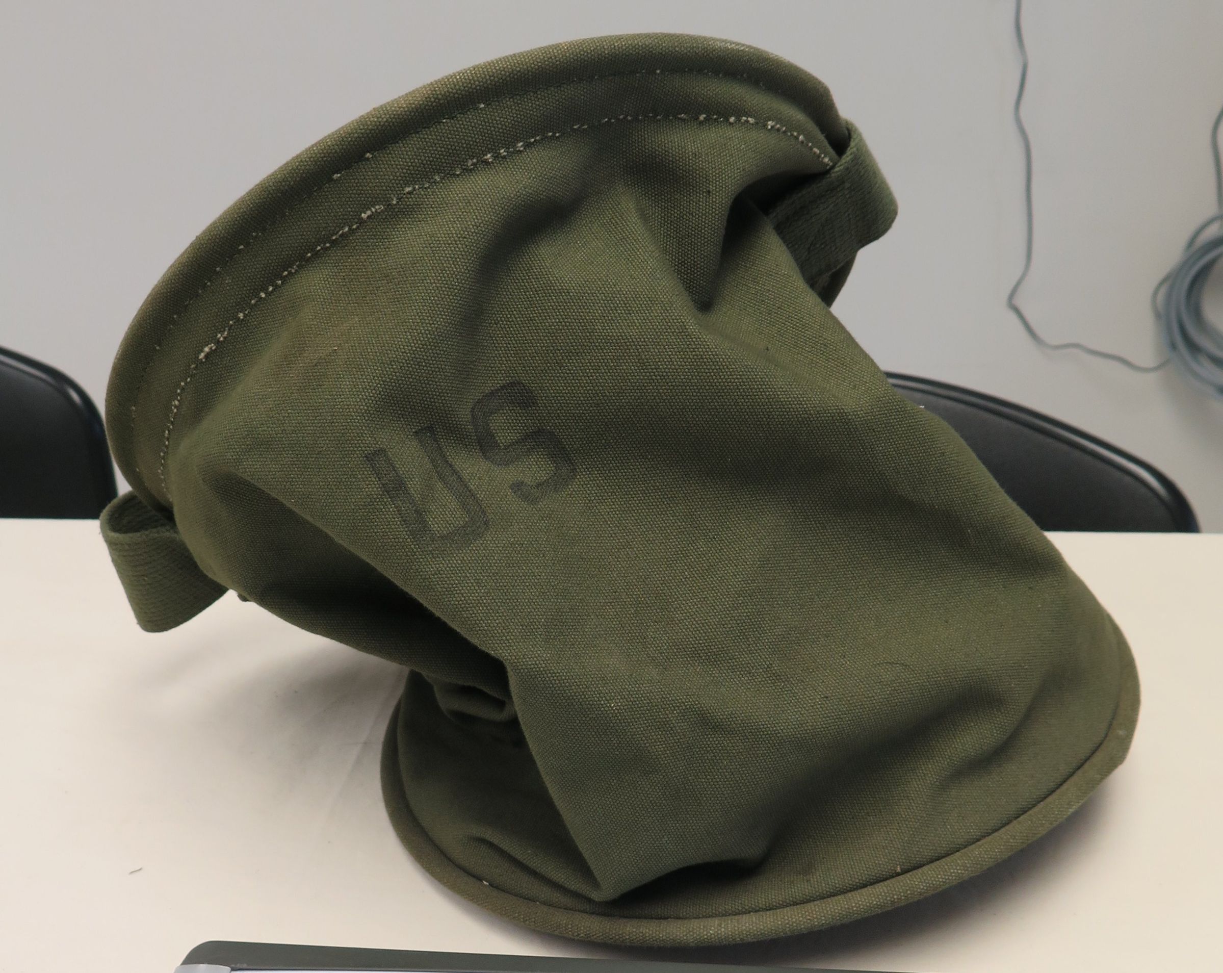 This is a portable shower bag issued by the US Army. It is olive green canvas with the text, "US" stamped on it in black ink. The bag measures 15" (h) x 12" (dia).