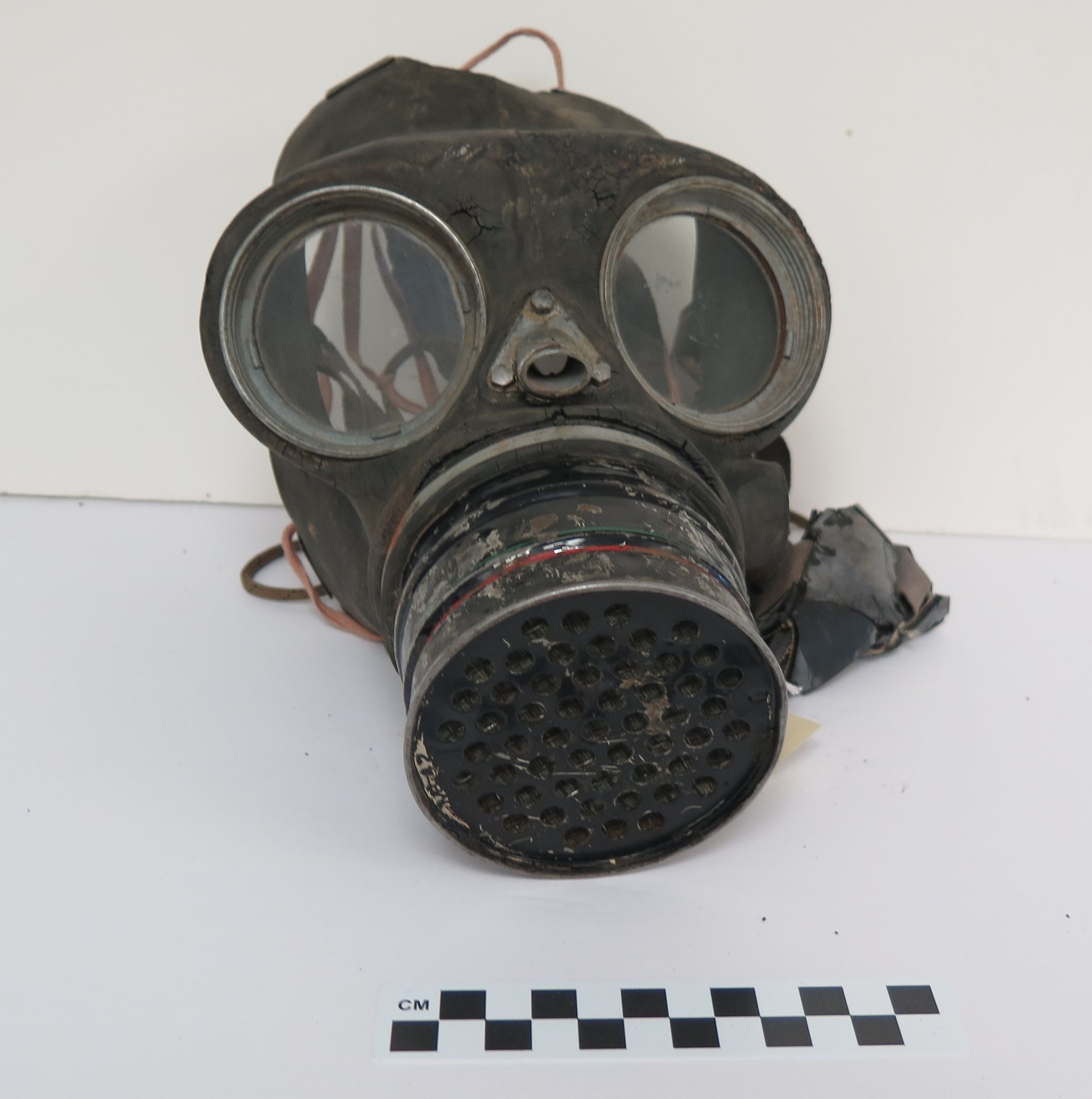 This is a military issued gas mask from World War II (WWII). The mask is a HBS 3 from 1941. The date is printed inside of the mask, near the eye. The rubber on the mask is cracked and falling apart. The mask measures 7" (w) x 11" (l).
