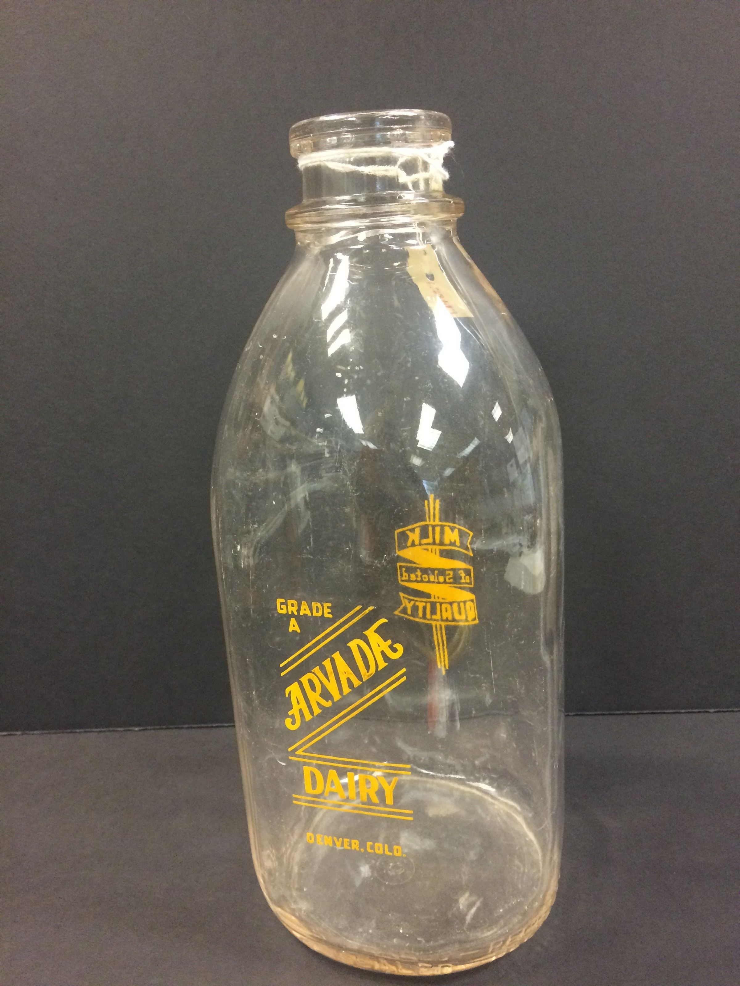 This is a clear glass half-gallon milk bottle with graphic design and text in yellow-orange. On one side of the bottle is "Grade A/Arvada Dairy/Denver, Colo." and the other side: "Milk of Selected Quality." Note: This item did not have a known number associated with it. I assigned it L1987.1.7 to help with record keeping and attached a paper tag to the mouth of the bottle. JAC10/21/2015